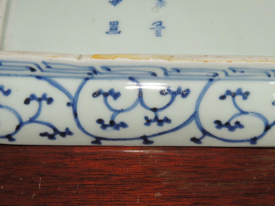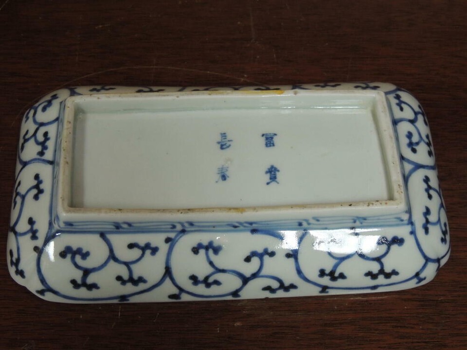 - Fuki Choshun Dish/ Tray 8.25"x4.5" Doucai blue red green mark shishi rectangular