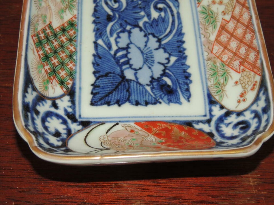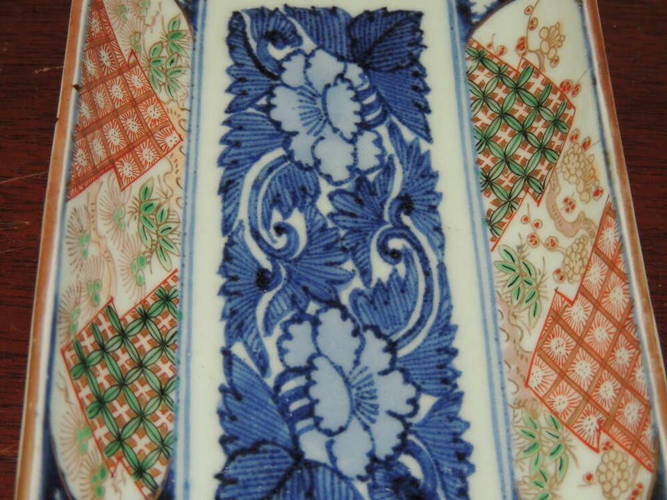 Fuki Choshun Dish/ Tray 8.25"x4.5" Doucai blue red green mark shishi rectangular