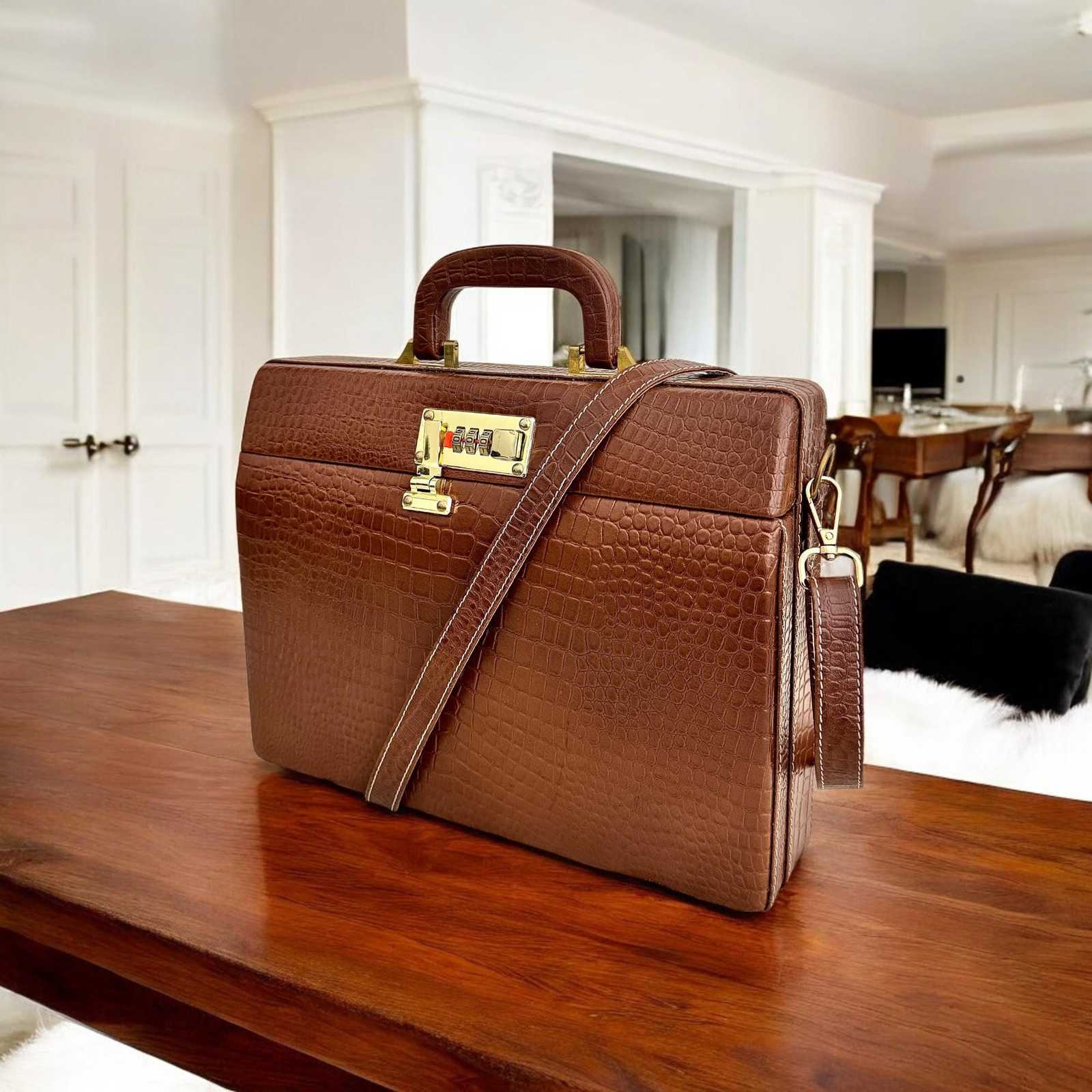 - Full Grain Leather Briefcase: Handmade Brown Laptop Bag with Combination Lock