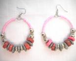 - FUN PINK COCONUT WOOD & ANTIQUE ALLOY & SEED BEADED HOOP DANGLING EARRINGS