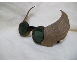 Winged Costume Goggles. Gold Brushed Frame. Greenish Tinted Lens. Has a black adjustable band in the back with attached brown tone wings. One wing on each side. Can be worn as goggles, around top of head, over a hat as a hat band. Nice Goggles. DOES NOT INCLUDE MANNEQUIN.