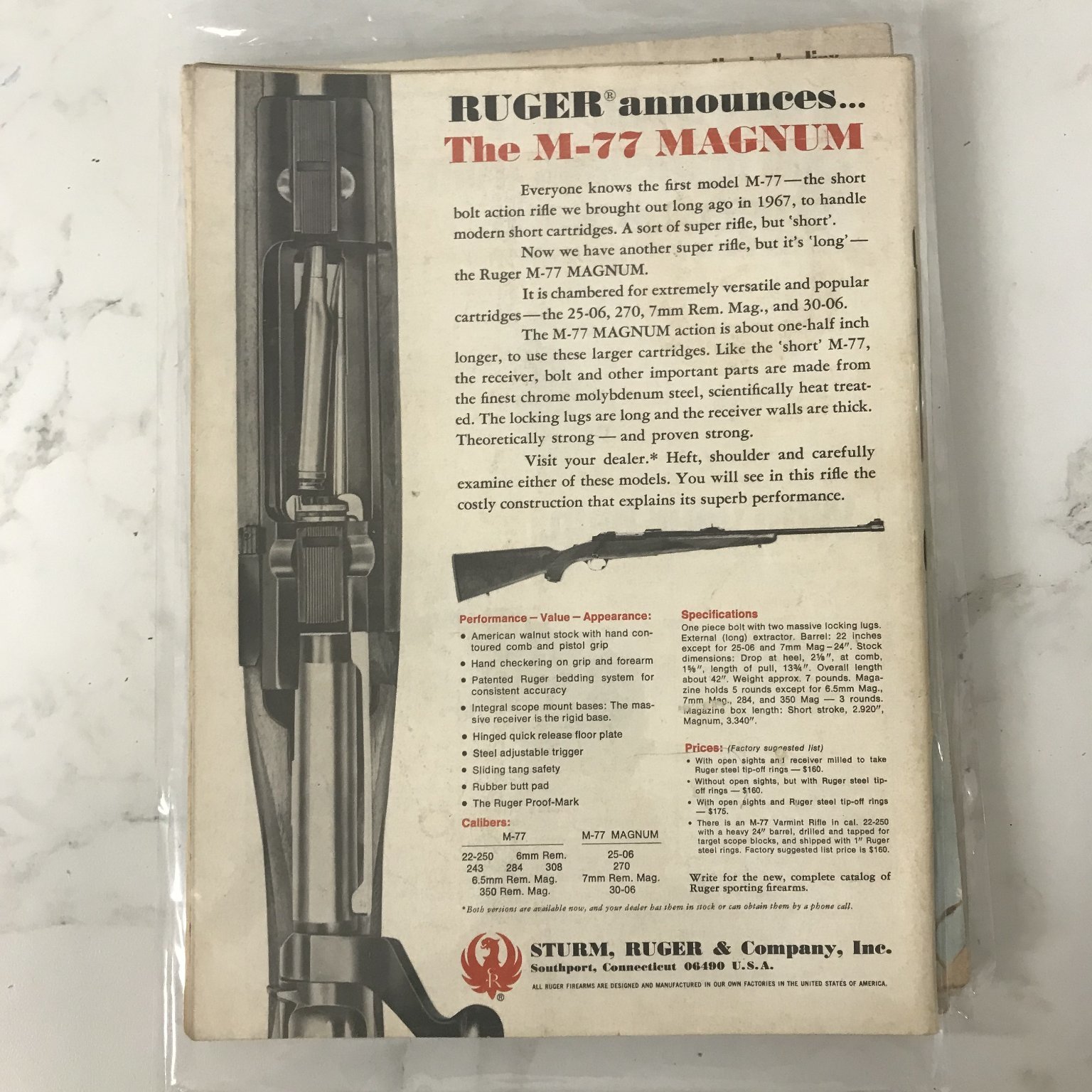 The magazine is a softcover edition, approximately full magazine size, with numerous articles, period advertisements, and detailed illustrations. Notably, it includes an advertisement for the Ruger M-77 Magnum rifle on the back cover, highlighting the firearm's features and specifications. This issue provides not only practical outdoor knowledge but also a nostalgic look at 1970's American sporting culture and equipment. A must-have collectible for vintage magazine collectors and outdoorsmen alike.