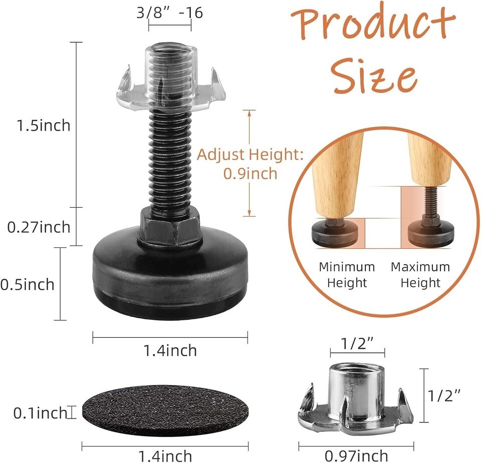 Furniture Levelers with Felt Pads - Heavy Duty Adjustable Support, 4 Pack Black