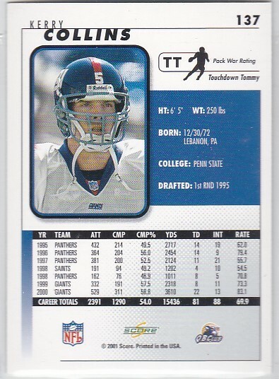 - G) 2001 Score Football Trading Card Kerry Collins #137