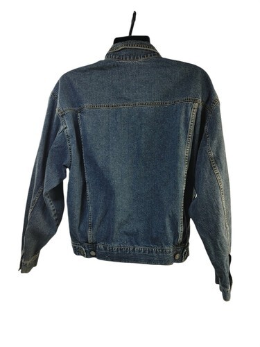 This GAP Premium Standard Men's Blue Denim Jean Jacket in size medium is a stylish and versatile outerwear option. Made from cotton denim with silver button closures, it features a classic point collar and a solid blue color. Perfect for casual occasions in the winter, fall, or spring, this jacket also includes a biker-themed design and is suitable for activities like walking and hiking. With a comfortable cotton lining and insulation, this denim jacket from Gap is a timeless addition to any man's wardrobe.