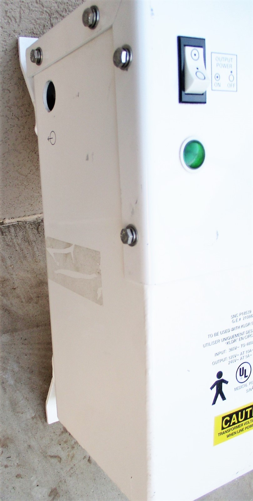 This is a used item. It is in good cosmetic condition. It is also marked, "Input 360-480V, Output 120V at 10A, 240V at 5A". We are not able to test it. It only comes with what is shown in the pictures.