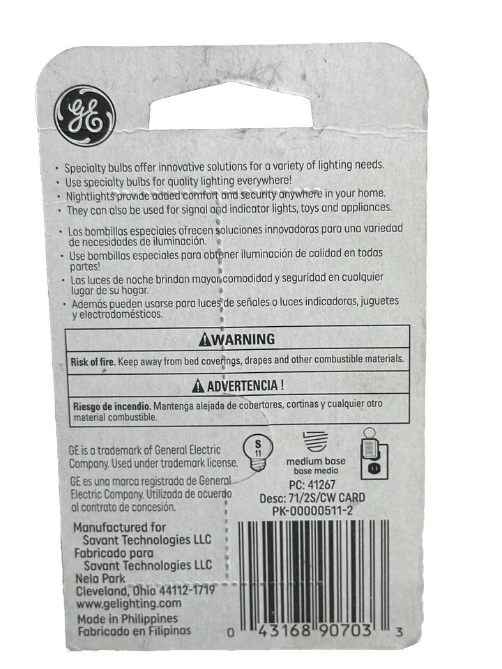 - GE Specialty Nightlight Bulb S11, 7.5W Medium Base, White 120 Volts New