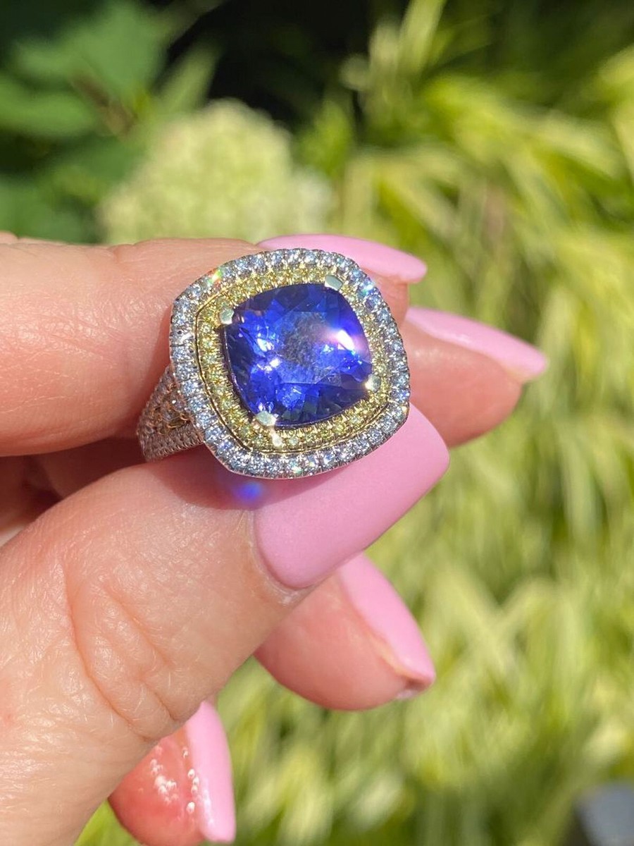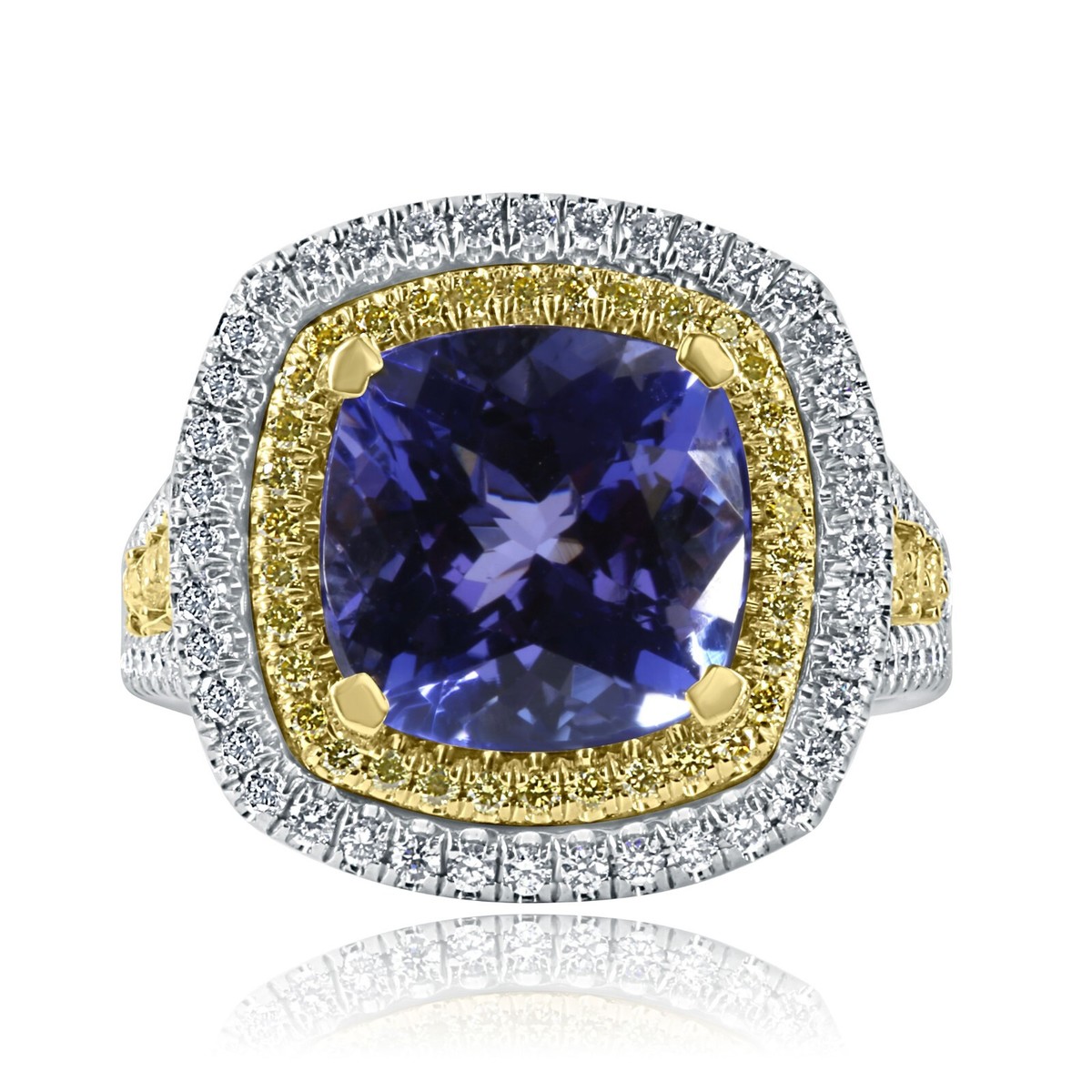 Art deco design engagement ring features a GIA certified 4.71 carat bluish violet cushion brilliant cut tanzanite surrounded by a double halo of colorless and yellow round brilliant cut natural diamonds in micro pave setting. Additional diamonds line the split shank completing the shimmering elegance of this ring!! The ring is crafted of 14-karat two tone gold that shines with a high polish finish. The total carat weight is 5.60 carats. The ring comes with Gemological Institute of America Certificate (GIA) Our products are all hand made with quality and care, in the heart of the diamond district on 47th Street in New York City. Our dedication and commitment to fine work and quality exceeds all others. Since all of our products are handmade in the USA, every piece shares the same level of a