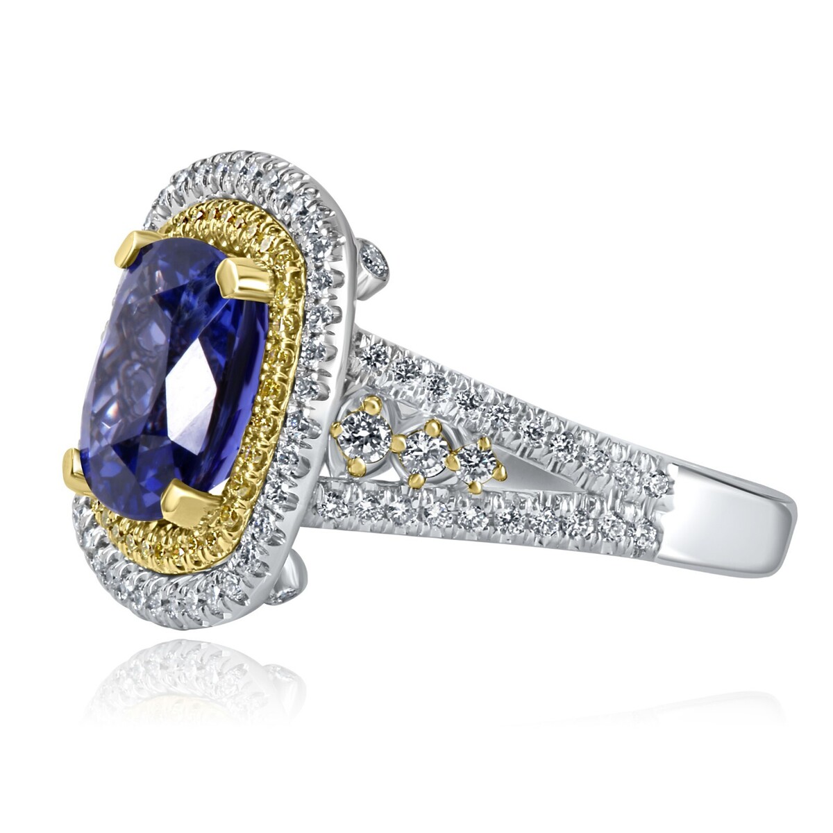 Art deco design engagement ring features a GIA certified 4.71 carat bluish violet cushion brilliant cut tanzanite surrounded by a double halo of colorless and yellow round brilliant cut natural diamonds in micro pave setting. Additional diamonds line the split shank completing the shimmering elegance of this ring!! The ring is crafted of 14-karat two tone gold that shines with a high polish finish. The total carat weight is 5.60 carats. The ring comes with Gemological Institute of America Certificate (GIA) Our products are all hand made with quality and care, in the heart of the diamond district on 47th Street in New York City. Our dedication and commitment to fine work and quality exceeds all others. Since all of our products are handmade in the USA, every piece shares the same level of a