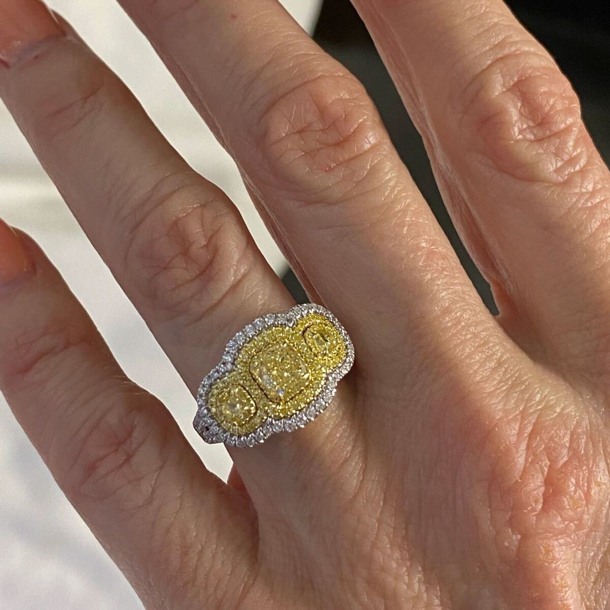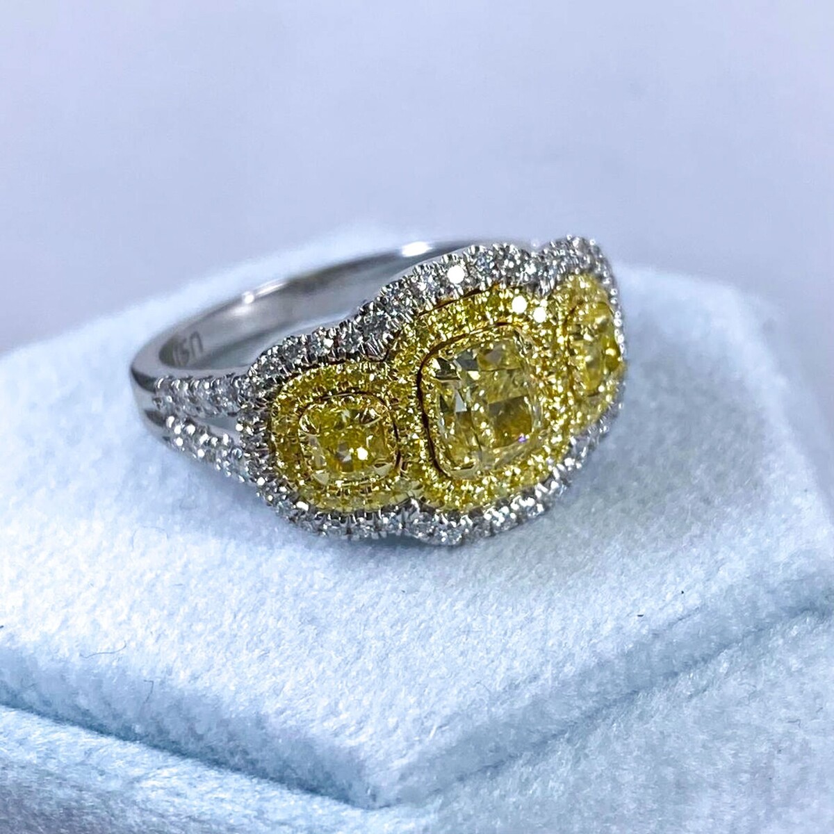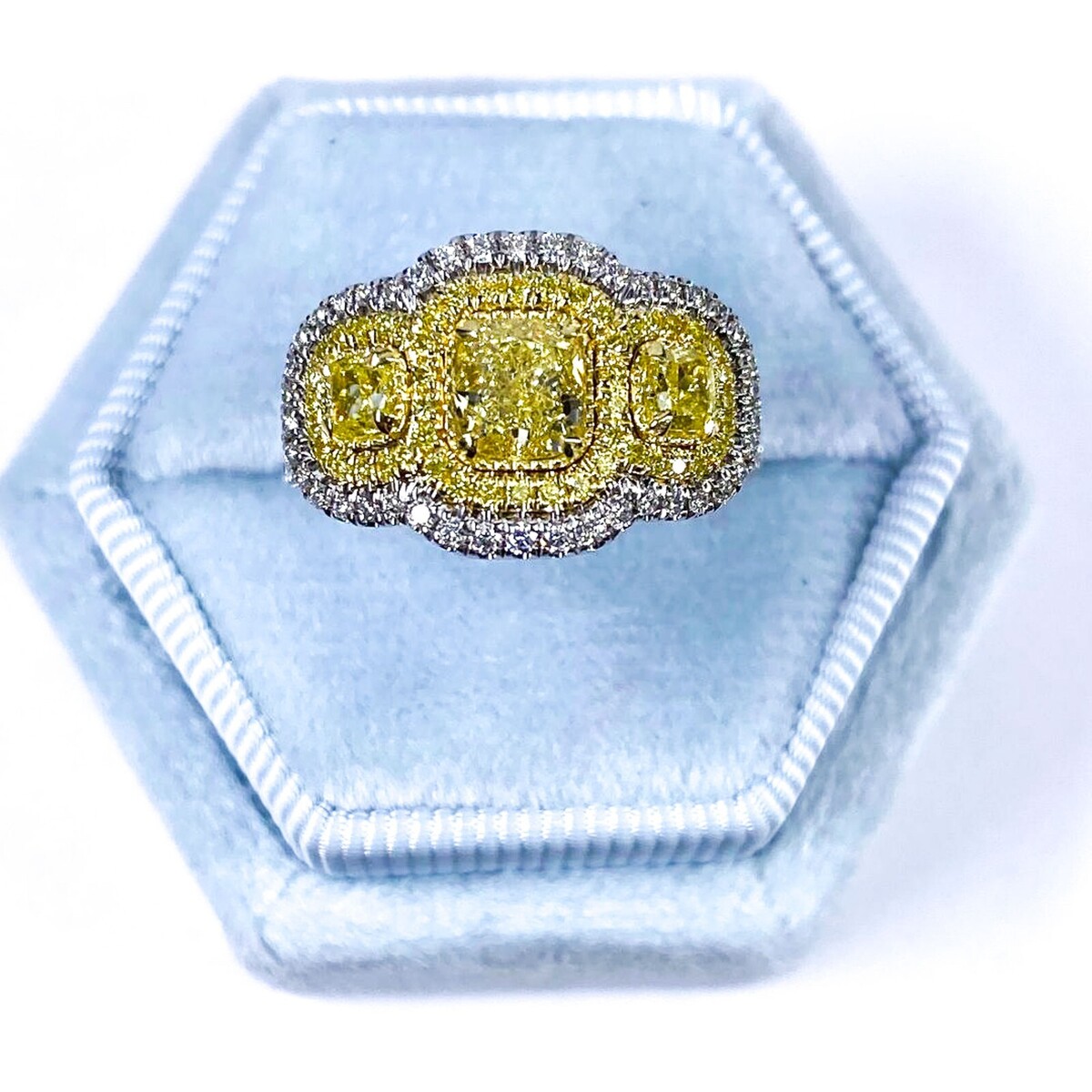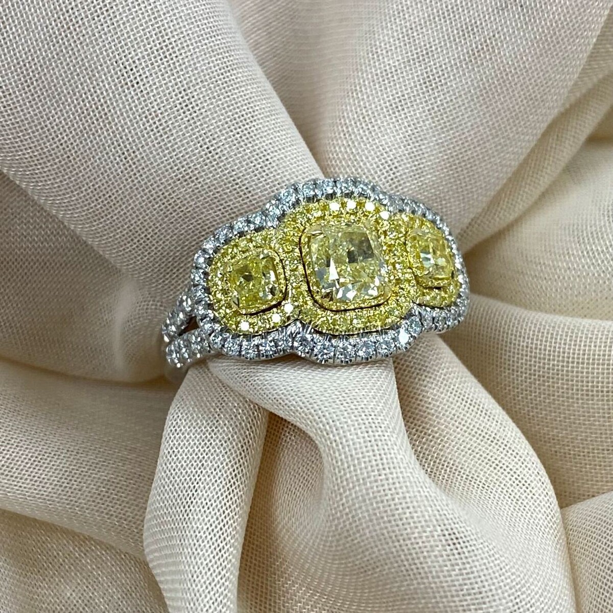 - GIA Certified 2.01 TCW Natural Fancy Yellow Cushion Diamond Ring 18k Gold