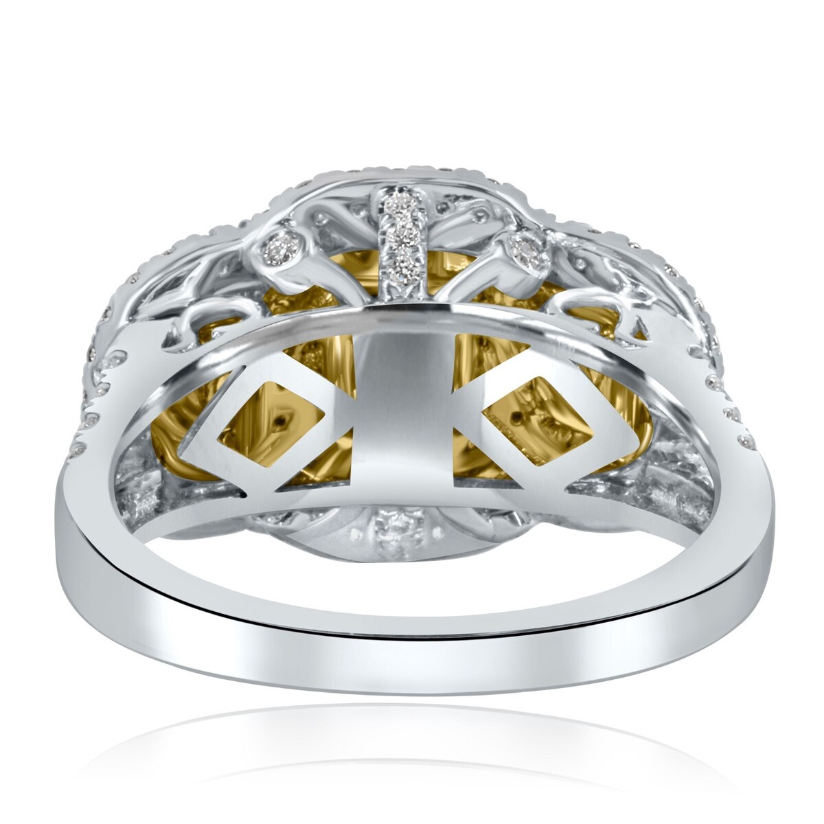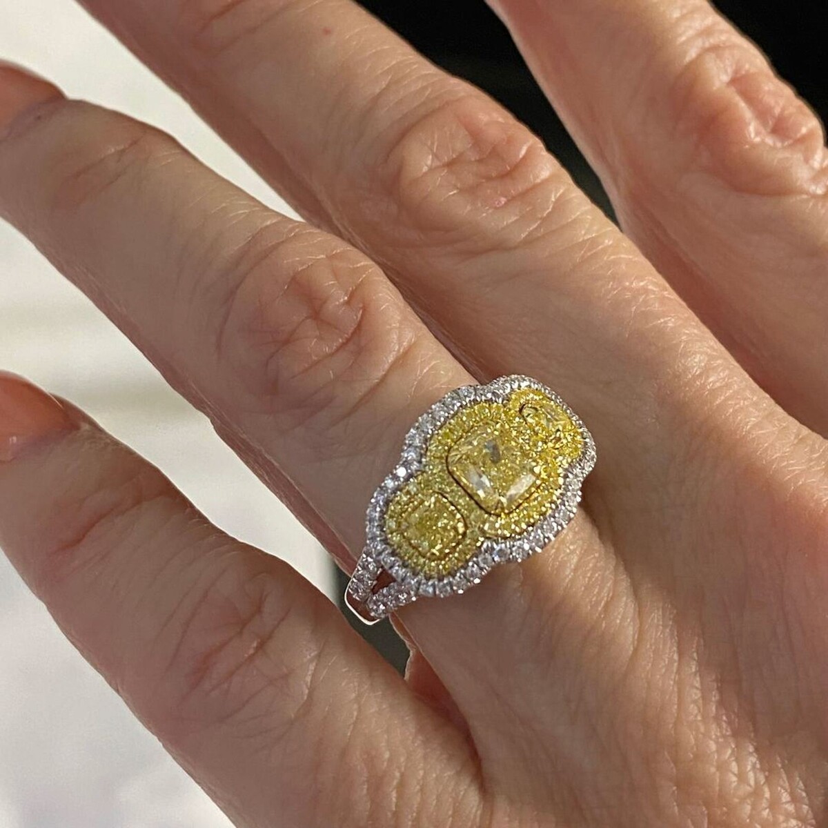 It's a perfect way to say - I Love You - with this gorgeous diamond ring! This art deco design engagement ring showcases a 0.75 carat GIA certified cushion cut natural fancy light yellow center diamond embraced by two natural fancy light yellow cushion cut diamond sides. The additional round cut colorless and yellow diamonds line the double halo and split shank adding an extra elegance to the ring. Handcrafted in 18-karat two tone gold. The total carat weight is 2.01 carats. Our products are all hand made with quality and care, in the heart of the diamond district on 47th Street in New York City. Our dedication and commitment to fine work and quality exceeds all others. Since all of our products are handmade in the USA, every piece shares the same level of attention to detail ensuring that