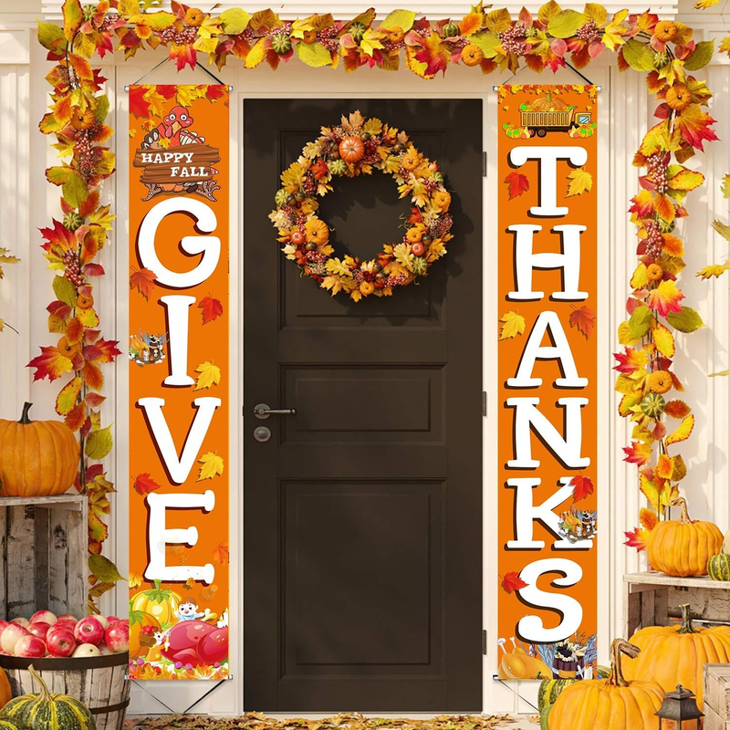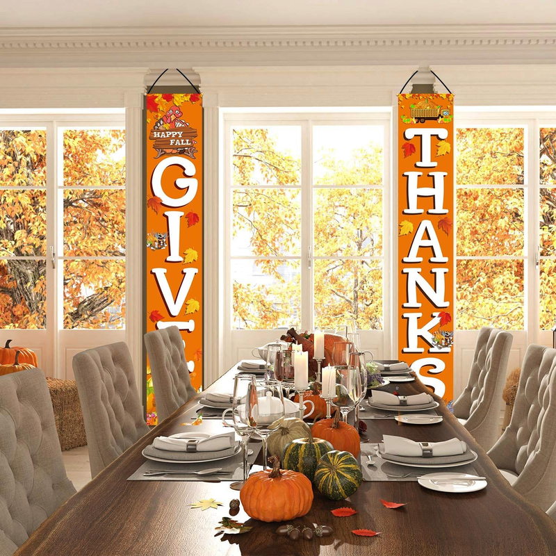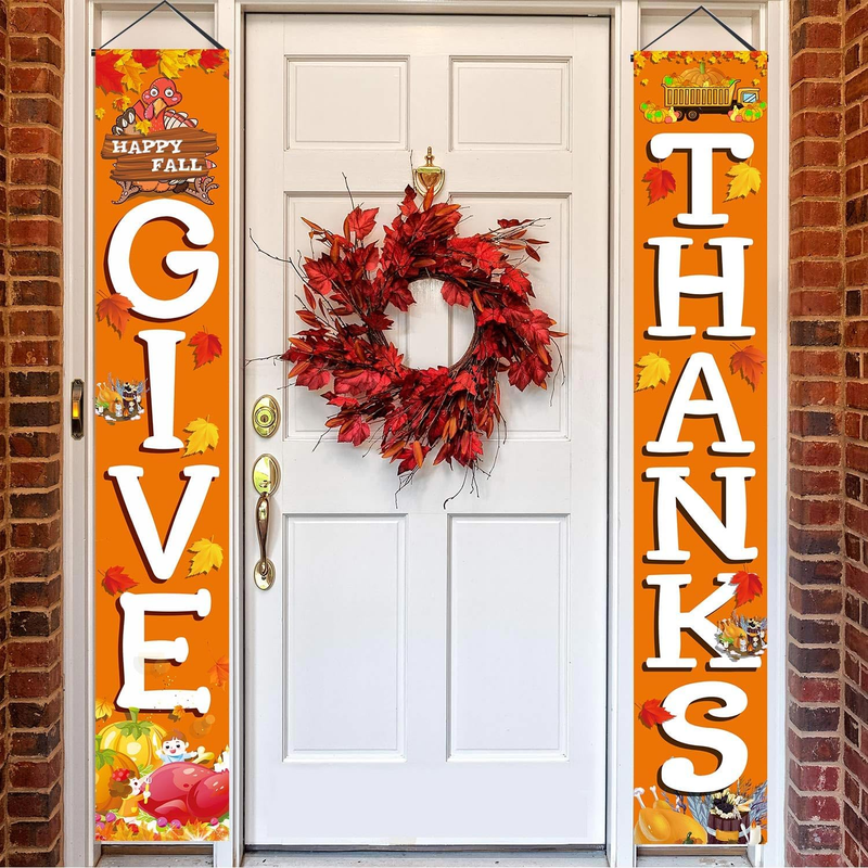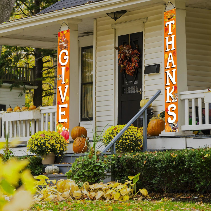 - GIVE THANKS Hanging Banner Porch Sign Autumn Pumpkin Maple Leaf Backdrop Flag Fa