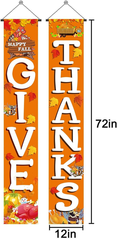 Package: It include 1 pair of porch sign: 1 x GIVE banner; 1 x THANKS banner. each banner with hang rope. So it is very easy to hang! Each Flag banner size is 72 inchx12 inch.