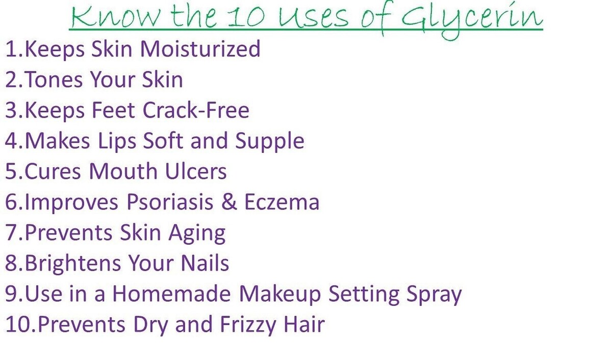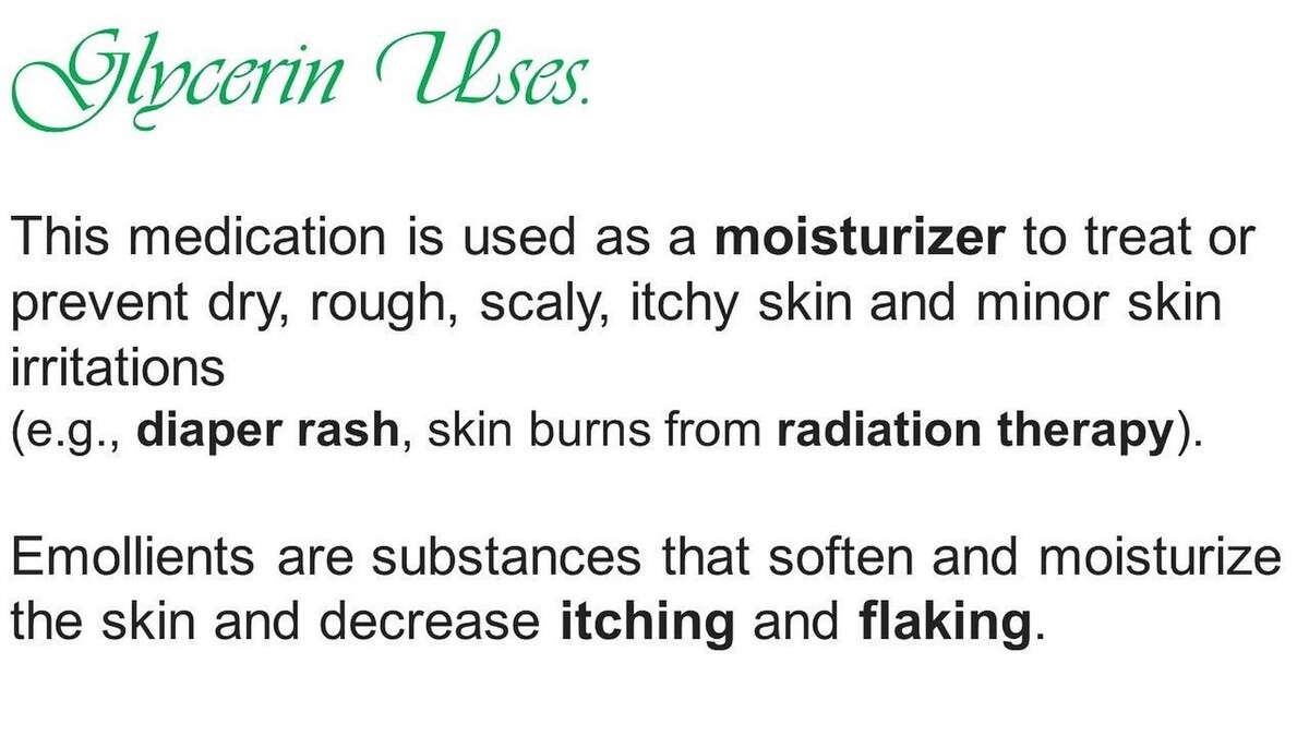 glycerin is sometimes used as a moisturizer to treat or prevent dry, rough, scaly, itchy skin and minor irritations like diaper rash, or skin burns from radiation therapy. emollients are substances that soften and moisturize the skin, decreasing itching and flaking. this liquid glycerin by equate brand will help keep your skin moisturized, tones the skin, keeps feet crack free, makes lips soft and supple, helps cure mouth ulcers, glycerin helps improve psoriasis and eczema, helps with skin aging, brightens your nails, use this liquid glycerin in home made makeup setting spraY, helps prevent dry or frizzy hair.
