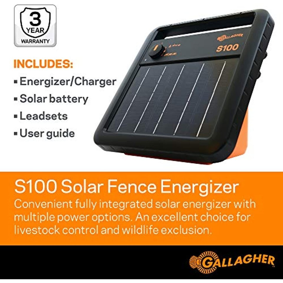 The Gallagher S100 Solar Electric Fence Charger ? Reliable, Portable, Easy to Use Make Gallagher the heart of your farm fencing system. The S100 Solar Fence Energizer is ideal for managing rotational grazing and excluding wildlife and livestock from crops, orchards and gardens. The S100 portable solar fence energizer features: Built-in solar panels, rechargeable 12V battery leadset 360-degree mounting, making it easy to attach to a fence post Dual power options - Wildlife Mode (pulses fast day night) and Full Power Mode (pulses fast during the day slower at night, conserving power) Unique automated battery management that extends usage up to 3 weeks without sun Battery status indicator that tells you whether the battery needs to be charged or replaced Water resistant case with carry handle lightning protection Once the battery is fully charged, the solar energizer can work for up to 3 weeks without sun exposure, making it ideal for remote locations. Quick to install, you can set your solar electric fence up, then forget it, or move it around as needed for better pasture management or protection from predators wildlife. It?s tough enough to be left outside in all weather conditions too. The solar powered portable charger comes with a 3-year warranty and comprehensive customer support for your complete peace of mind. Product Details: 1 Joule Solar Fence Energizer Battery Covers 30 miles And 100 Acres 360-Degree Mounting 3 Year Warranty For the best in Solar Powered Energizers Click Add To Cart now to order your Gallagher S100 Solar Electric Fence Energizer today!