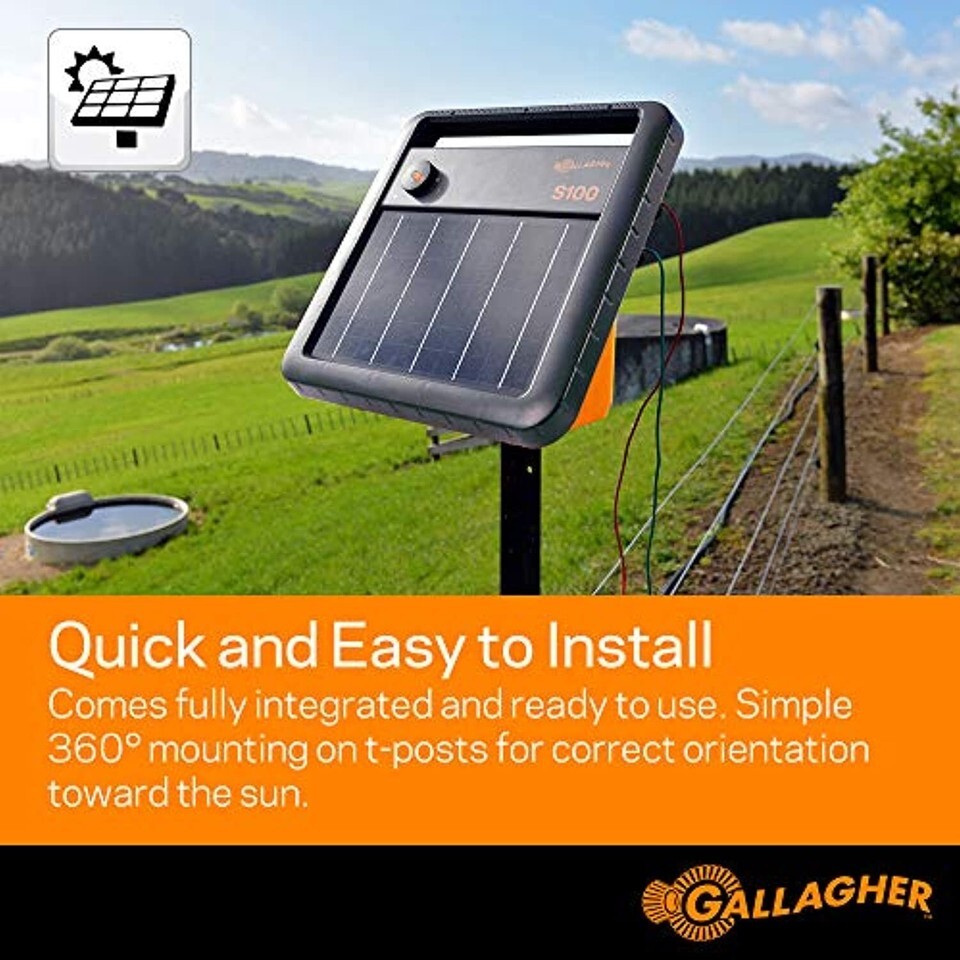 PORTABLE AND SUPER TOUGH SOLAR FENCE ENERGIZER: The Gallagher S100 is a portable, super tough unit that?s quick and easy to install and comes with a built-in solar panel and 12V battery. Perfect for rotational grazing, controlling livestock and excluding wildlife.