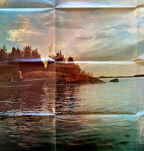 Double sided. One side shows a landscape with men fishing in a boat...the other has a chart of popular game fish of Canada