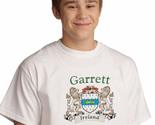 Product description: Garrett Irish Coat of Arms Tee Shirt in White. Every Irish family has a story to tell, probably hundreds of stories. Your Irish coat of arms is a visual record of your family's oldest, most significant stories. Here, they're told in bright, permanent artwork on these fine-quality, 100% cotton Gildan tee shirts. Over 25 years of heraldry research and over 1000 available Irish family coat of arms.