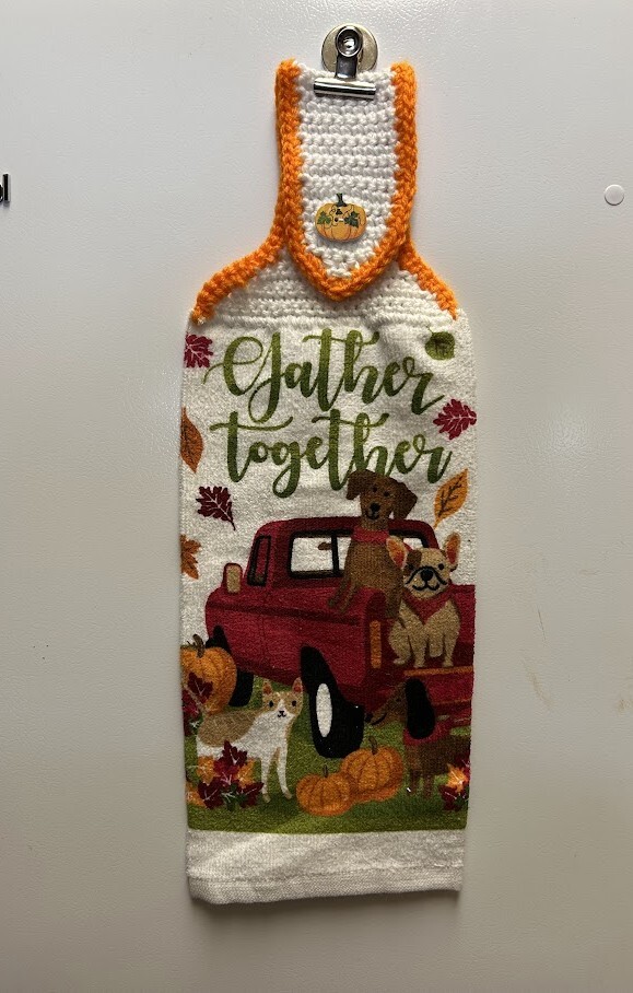 Great for a friend or your kitchen if you love dogs and cats.. this hanging towel is topped in white yarn and edged in orange yarn with a matching pumpkin button.