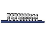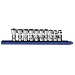 Set includes: 10mm, 11mm, 12mm, 13mm, 14mm, 15mm, 16mm, 17mm, 18mm and 19mm 3/8" drive metric 6 point flex sockets. Packaged in a socket rail.