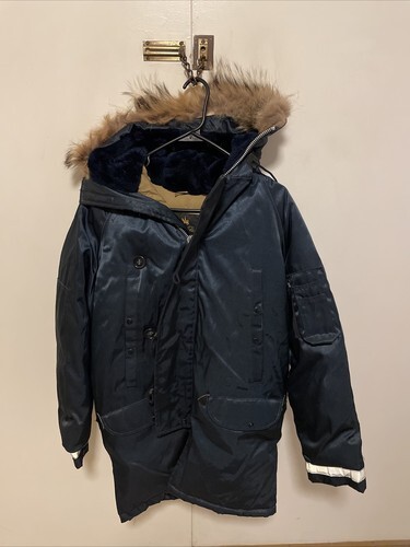 Goldene Fleece-Parka-Jacke für Herren, Große L, Vintage-Stil, Flying Snorkel, Militar, USA, erstklassige Gansedaunen aus dem Norden, in gutem gebrauchten Zustand. Ich sehe keine großeren Probleme, siehe Bilder. Auf dem Etikett steht 36, aber da meine Messung zeigt, dass die Brust 46 ist, hat sie einen großen Alaska-Aufnaher auf der Rückseite Lange 32 Achsel zu Achsel 23 Armlange 29 vom Hals