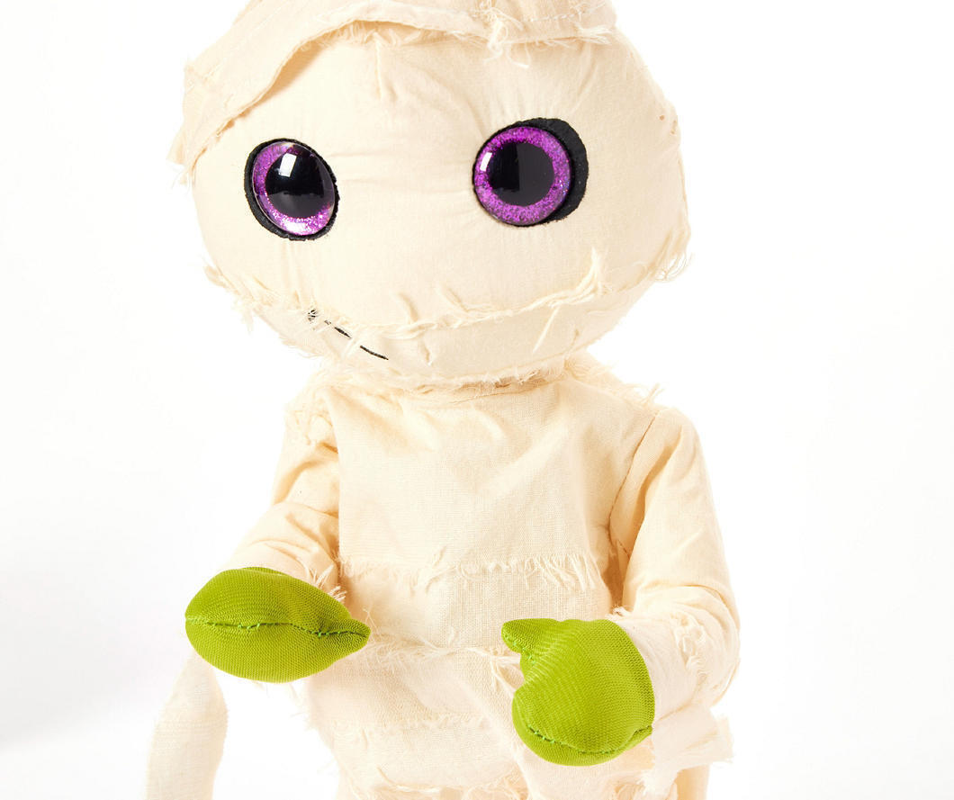 Cute mummy in wrapped cloth with green hands and purple eyes