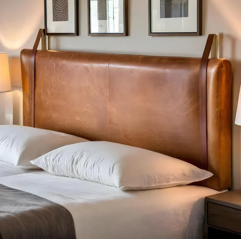 - Genuine Leather Strap Headboard – Handmade Brown Wall-Mounted Bed Headboard