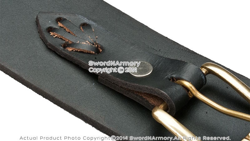 The belt is made of black leather with brass buckle. Frog is left open so you can stitch it closed to fit the sword of your choice.