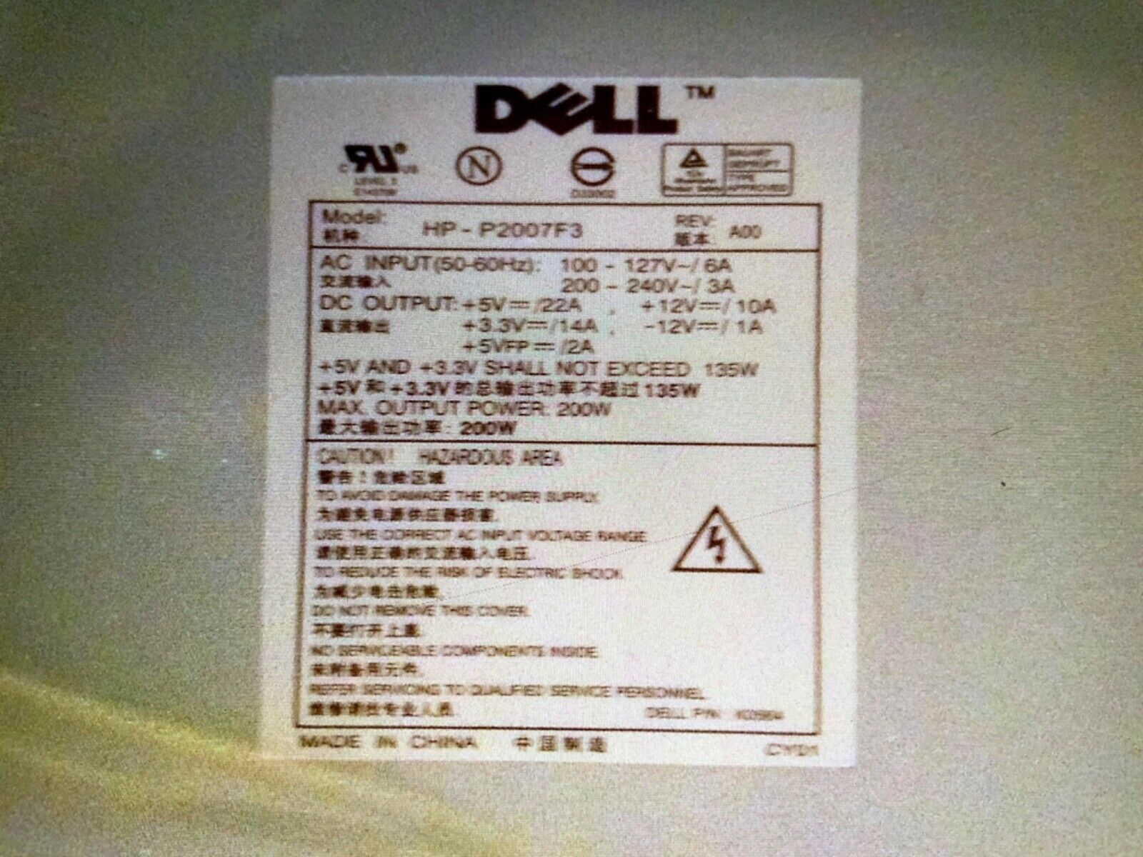 - Genuine OEM Dell HP-P2007F3 200W 200 Watt Computer Power Supply