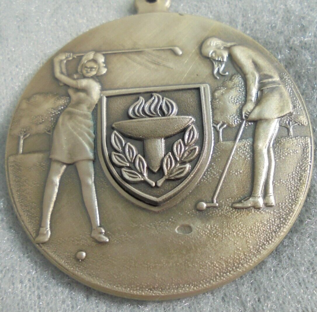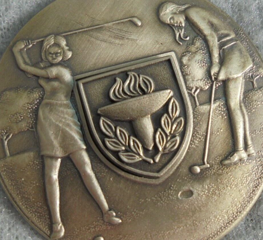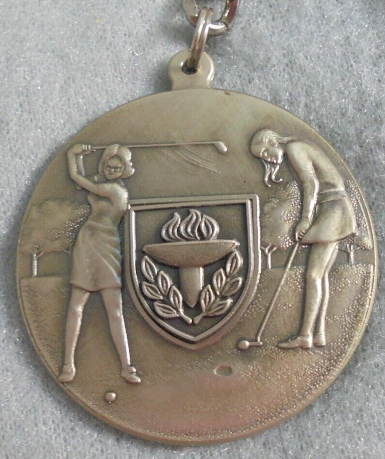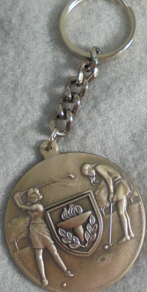 Description: Embossed front of women golfing and logo and back is engraved. Round with chain and ring for your keys.