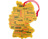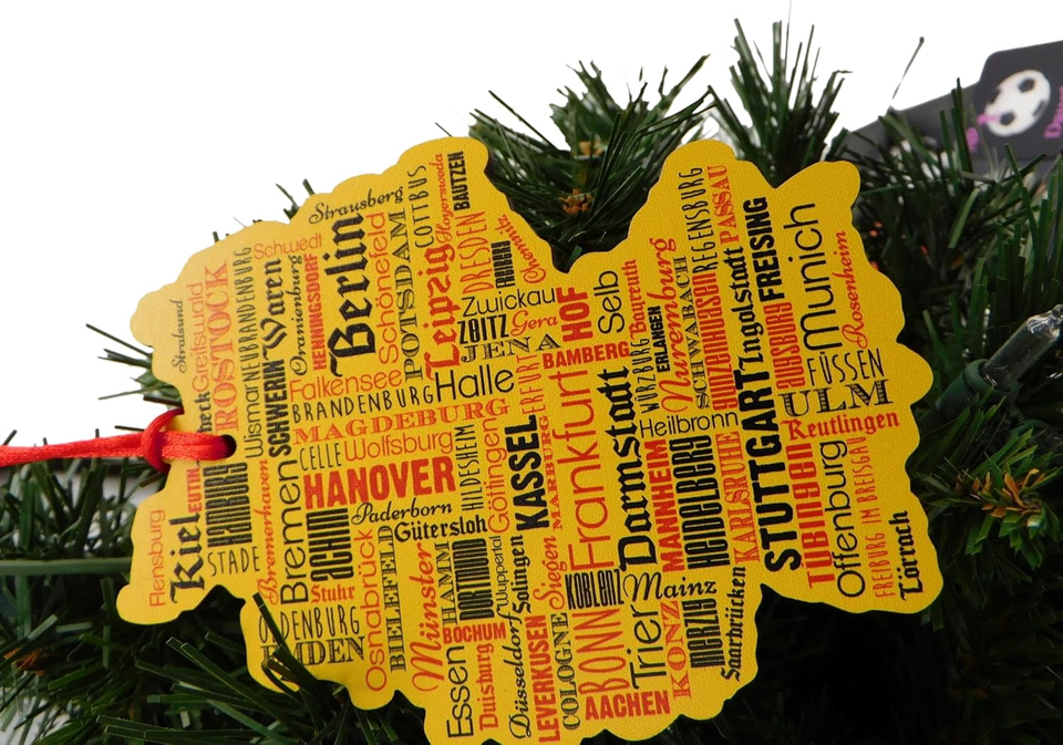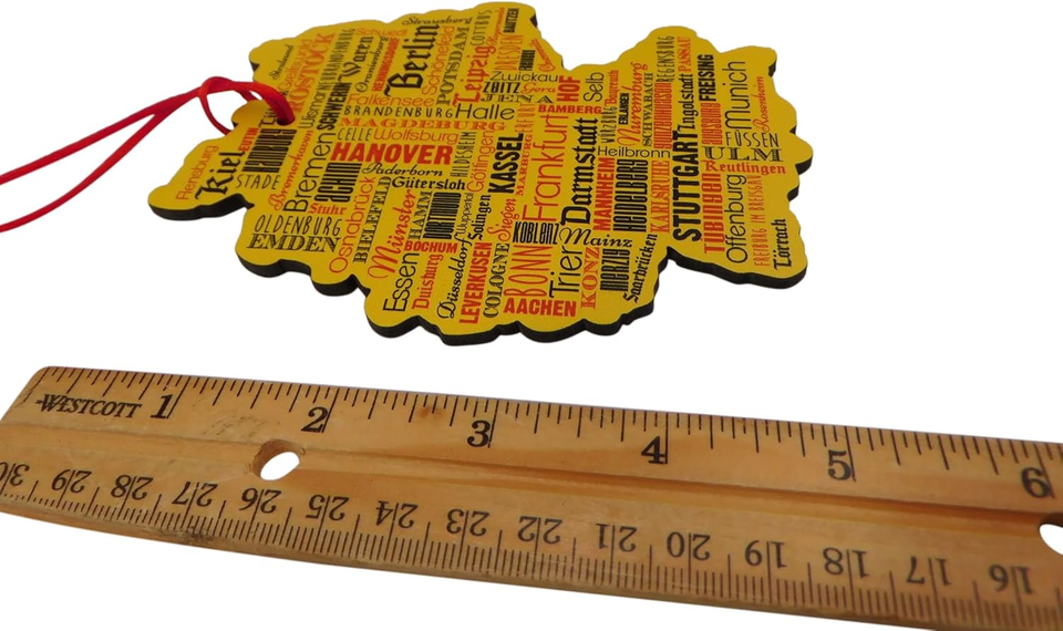 Beautiful Germany shaped Christmas ornament. Ornament comes neatly packed and ready for gift giving. This ornament is high quality finished wood with a red ribbon tie for hanging on the tree. All the big cities and towns of Germany are written on the ornament. The names however are not accurate to the actual geographic location in the country but rather for the purpose of spacing they are applied at random.
