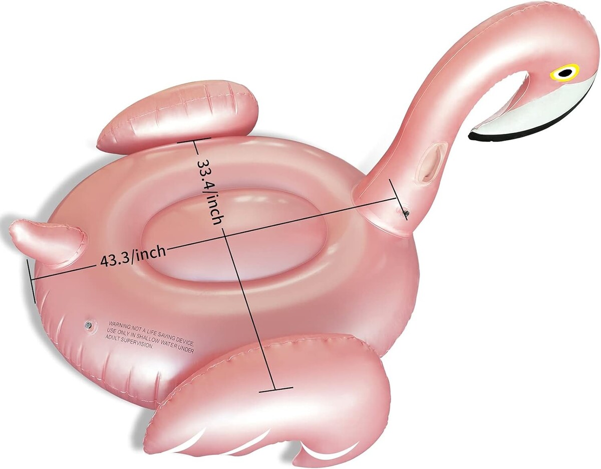SIZE: Giant heavy duty vinyl Flamingo 43x34 inch. The flamingo pool lounges are large enough to support up 1 adult lying on the back. Taking a break or sunbathing is the best choice for pool floaties DURABLE, INFLATABLE DESIGN: This extra-large pool float is made of strong and durable vinyl. Constructed with two heavy-duty handles and two air chambers for added safety. Includes a repair patch for convenience Fun FLAMINGO INFLATABLES: Summer water outdoor fun for adults. You will be the focus of the summer pool party it can be used at the beach and lake too. It holds up to 300 IBs so you can be bobbing to the rhythm of the waves all day long EASY SET UP: Configuration of the fast valve (nozzle), body, and head were inflated separately can be used repeatedly exhaust, durable TAKE IT WITH YOU: Because it's inflatable, you can deflate the float while not in use for easy storage. Bring it to the swimming pool, beach, or lake and get on the water fast. It inflates in just a matter of minutes