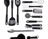 Includes: one peeler, one pizza cutter, one slotted spoon, one serving spoon, one whisker, grater, one slotted turner, one can opener, one food tong, one spatula, five measuring cups and five measuring spoons