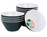 Liven up your dishware with this 12 piece plastic bowl set by Gibson Home. This bowl set is constructed with lightweight durable melamine that is top rack dishwasher safe for easy clean up. Each bowl features a multi colored leaf decal design and a hammered texture that will give a colorful accent to your favorite meals. The vibrant colors and fun design is perfect for outdoor gatherings, dining with kids, and every day use alike. Stack-able design makes it easy to save space while storing. Add some pattern and color to your cabinets with this tropical set!