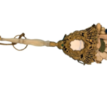 Incredible large bilt bronze tussie mussie with oval fan shaped cup. There is a flirting mirror on both front and back. It measures 6 1/4" long. There are small round dots of dark red and green enamel, some enamel is missing. Turned mother of pearl handle. Has pin and finger ring circa 1890s. Spectacular piece!