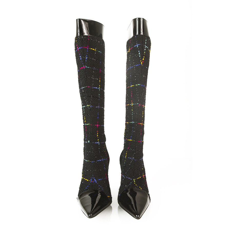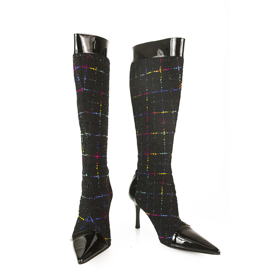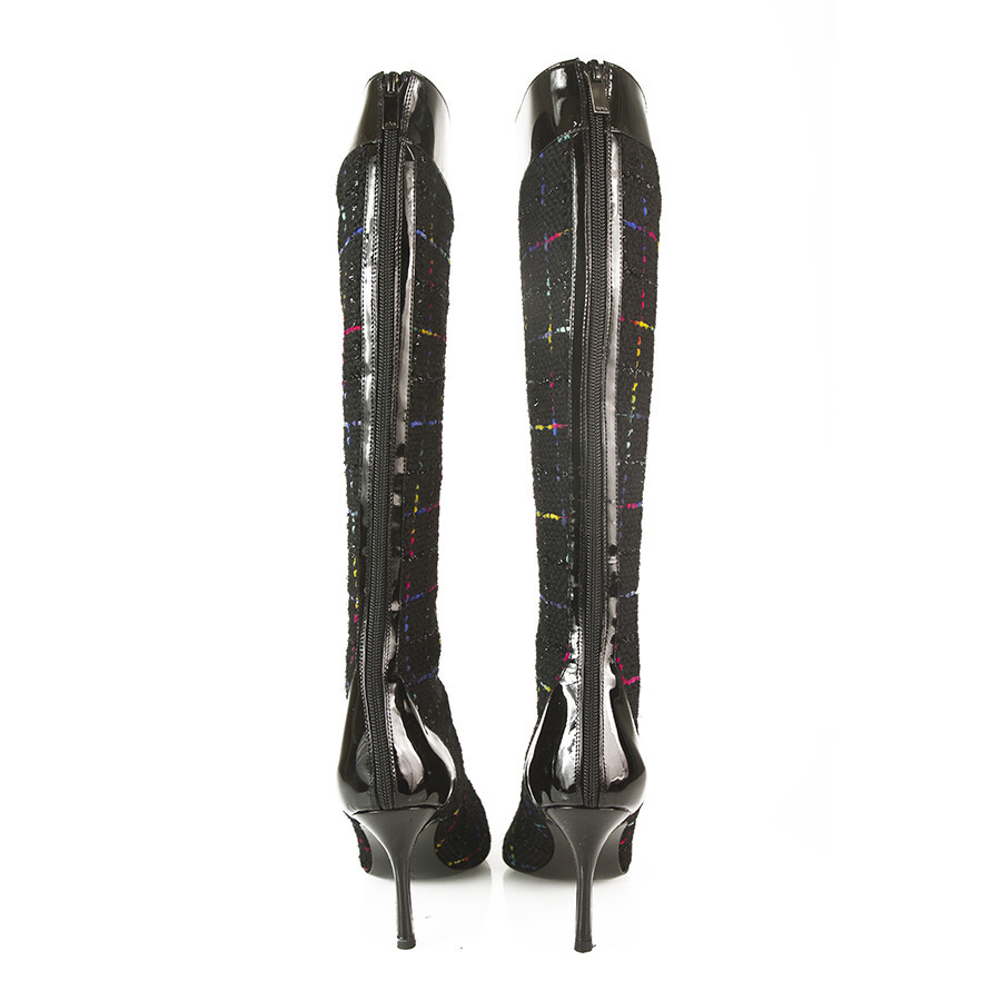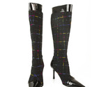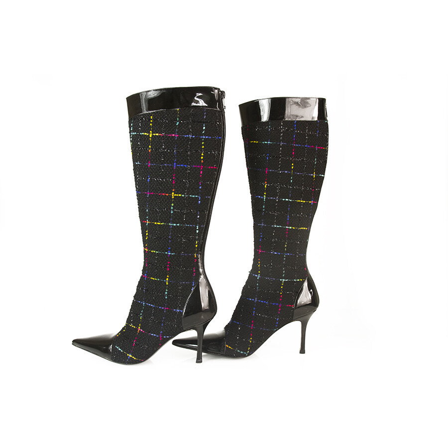 Add some style this winter to your look with these fashion statement boots by Gina !! These beautiful boots are made from tweed fabric in black backround with multicolor check pattern and black patent leather accents and feature comfortable 9cm heels, back zipper closure and pointed toes. Fabulous style, unique boots!! Celebrate the winter season in style with these amazing Gina boots.