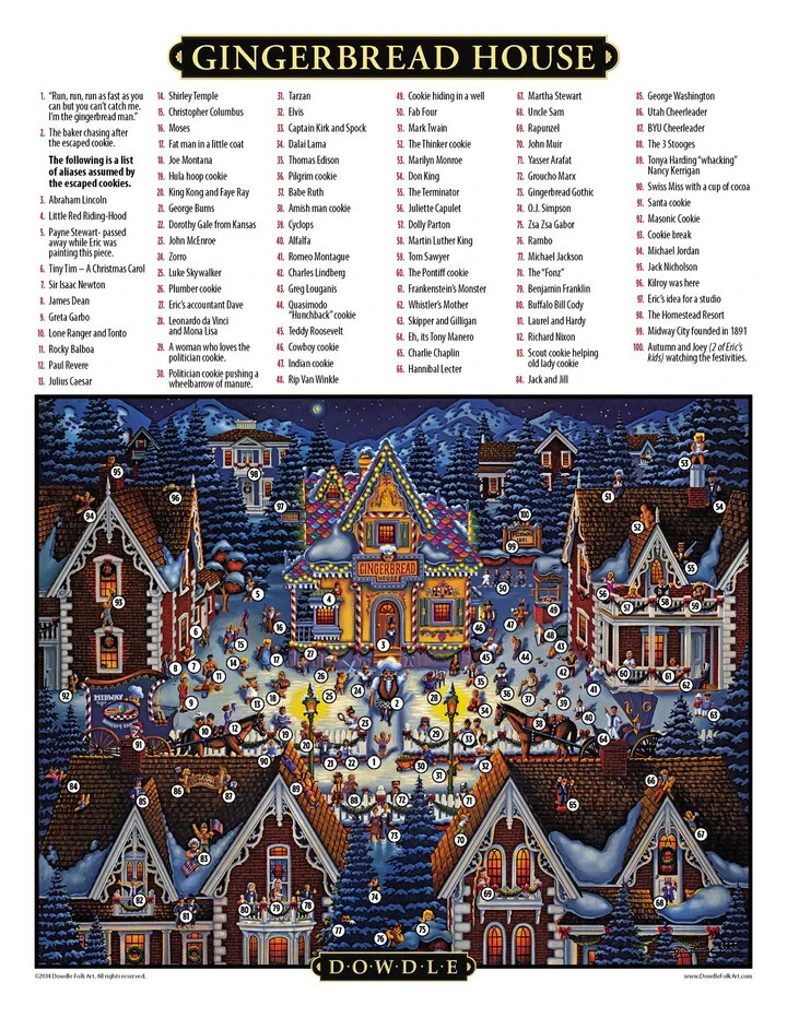 In this delightful Christmas scene, Eric has created a playful winter wonderland full gingerbread men of all types engaged in a variety of activities. In fact, if you look closely you will find some very interesting characters, many of them quite famous