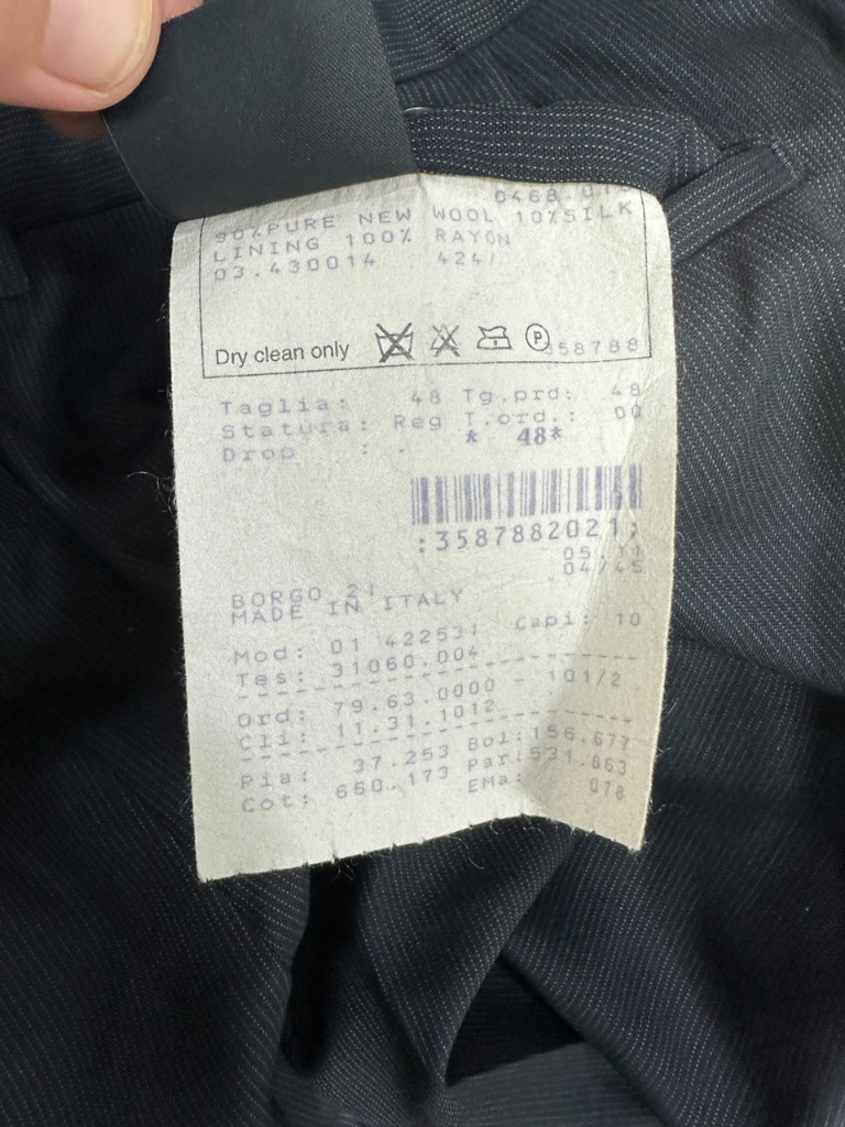 GIORGIO ARMANI S/B Navy Blue Wool / Silk Suit Size 48R IT / 38R - 32 Waist Made in Italy Not sure if it was ever worn as the pants are not hemmed There are a few small holes that we found on the jacket Please let us know if you require any measurements We guarantee authenticity of all the items we sell Comes as shown