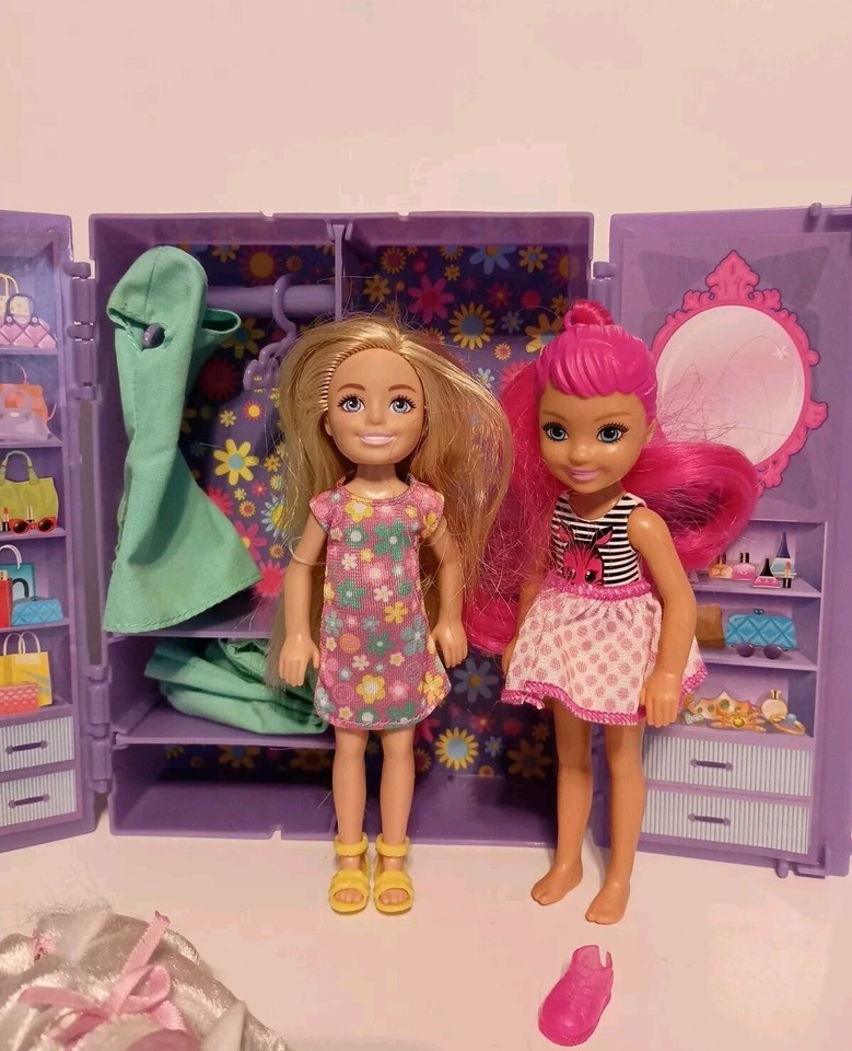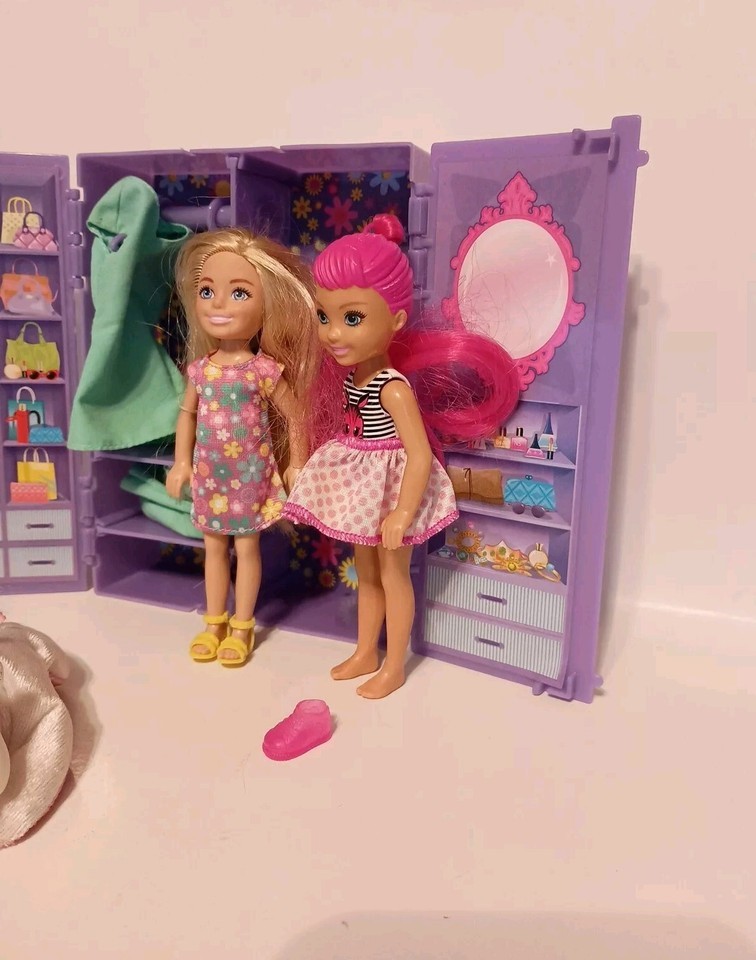 This mixed lot includes a variety of items, such as hangers and mini dolls, all in a beautiful shade of purple. Perfect for any collector or doll enthusiast, this lot features a girl dolls and is approximately 5" tall. The set includes a doll closet approximately 6.5" tall and is ideal for display or play. Whether you're looking for a unique addition to your collection or a fun toy for a child, this mixed lot is sure to delight. Normal wear. See pictures.