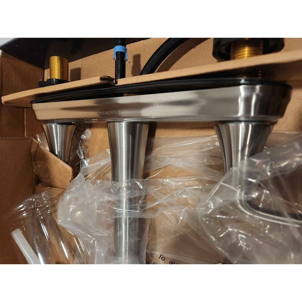 New open box Glacier Bay Sadira double-handle pulldown kitchen faucet with soap dispenser. Never installed. All parts included in original packaging: faucet body with pull-down sprayer, soap dispenser, mounting hardware, quick-connect supply lines, and manual.
