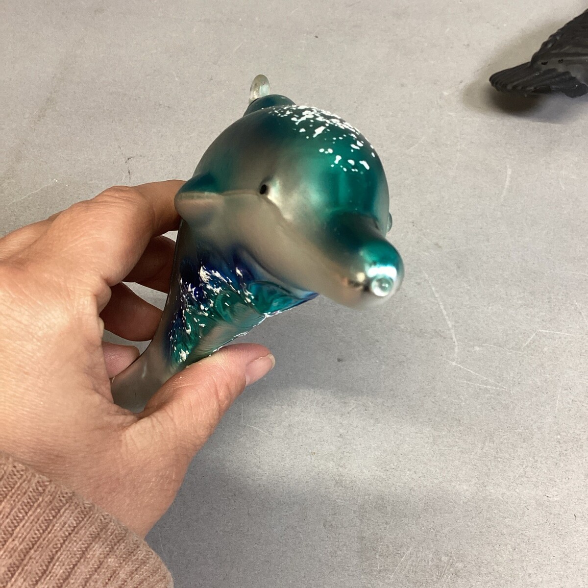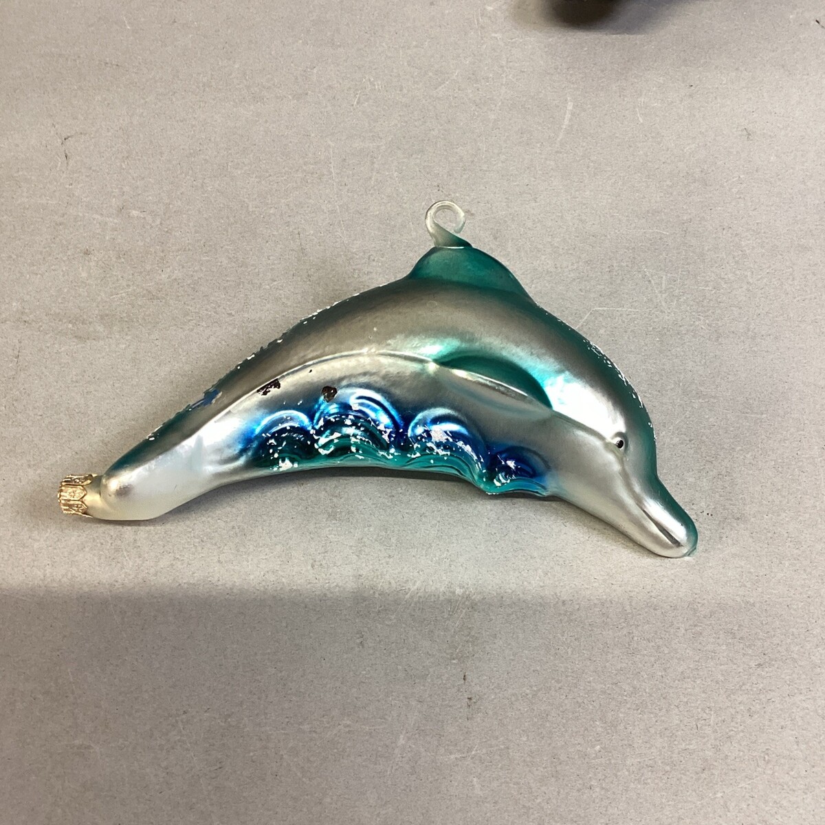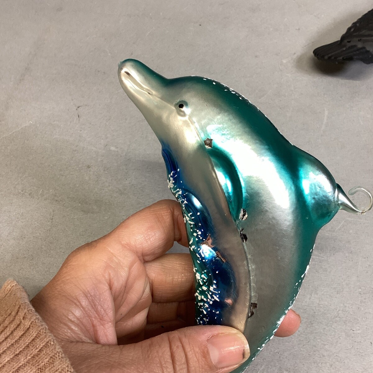 The dolphin has some missing paint and glitter. No cracks in the glass. This dolphin measures 6?L