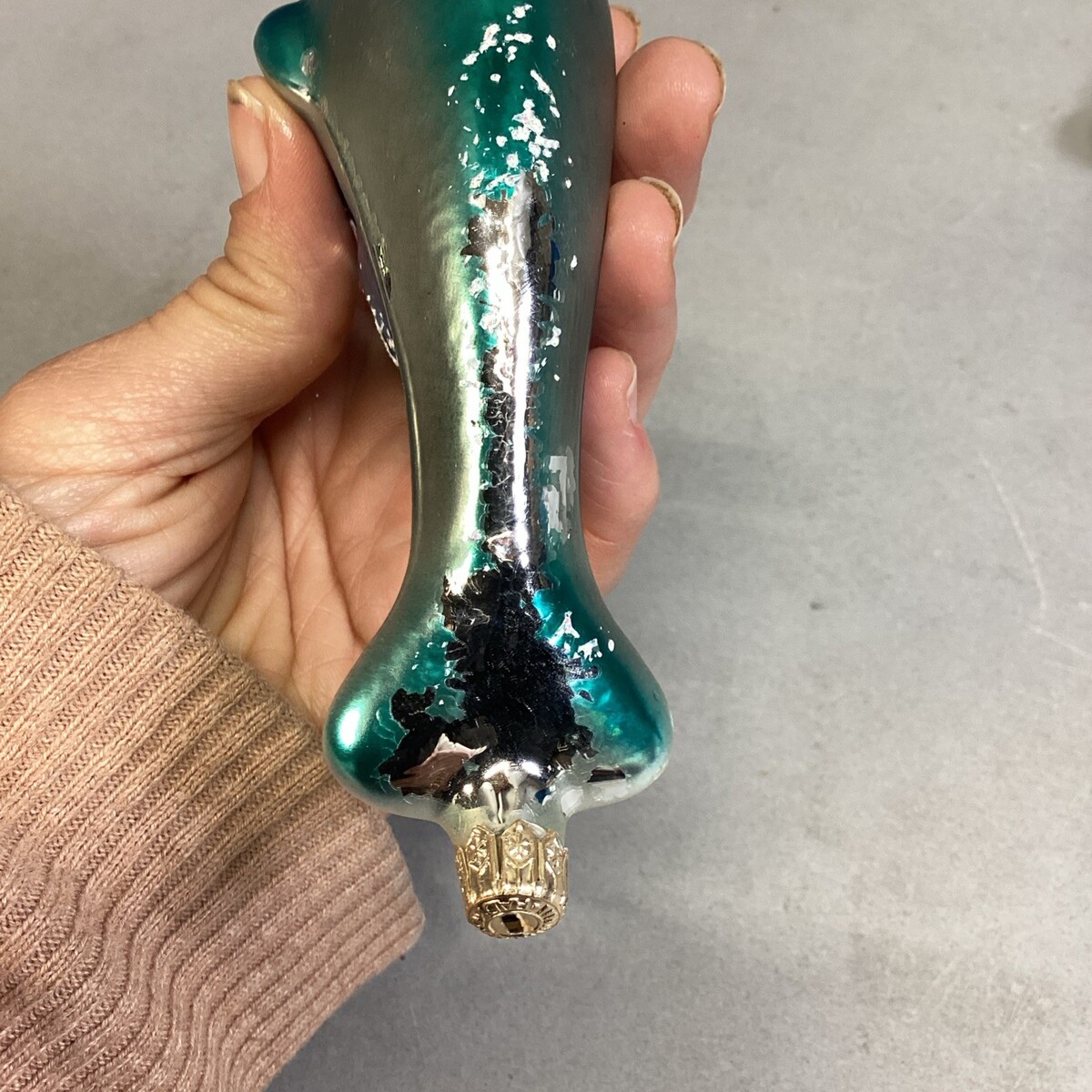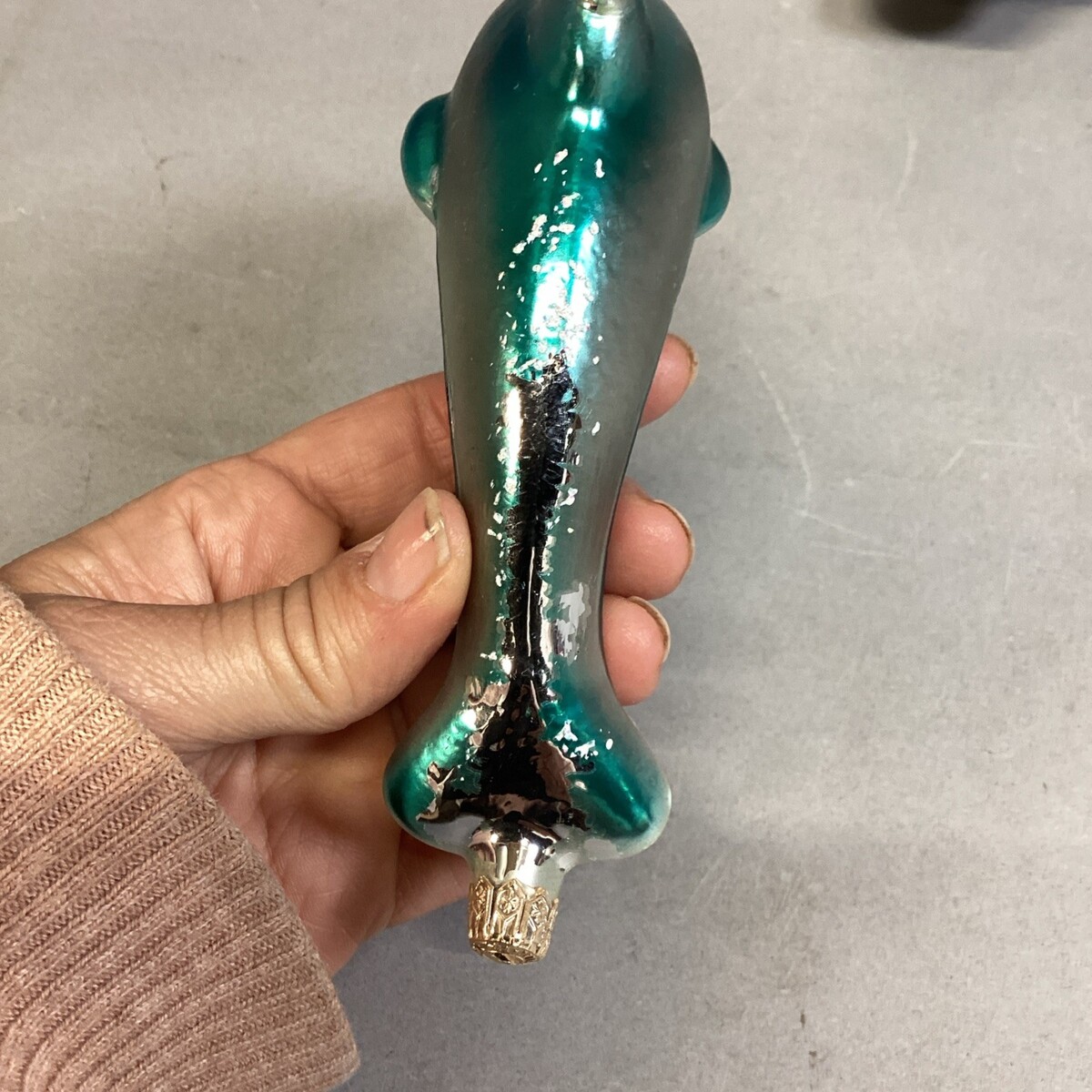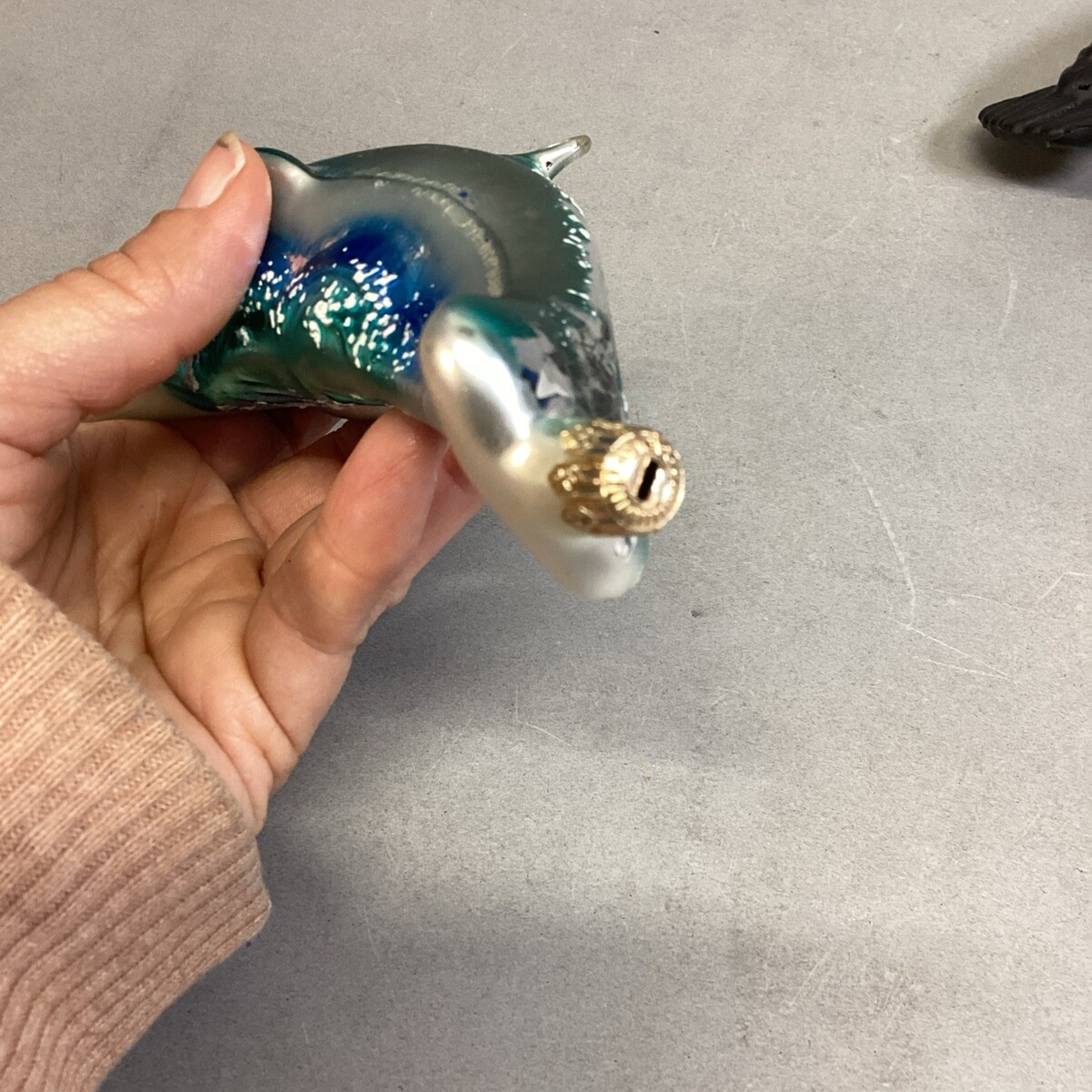 The dolphin has some missing paint and glitter. No cracks in the glass. This dolphin measures 6?L