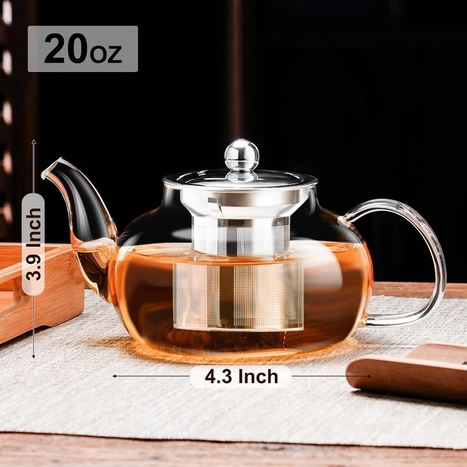 ?Multiple functions?The glass tea kettle for stove top has a capacity of 20 OZ, allowing you to prepare a variety of different beverages, teas, coffees as needed, brewing 1 to 2 cups at a time. The glass tea pot allows you to enjoy tea time with family and friends at any social gathering!