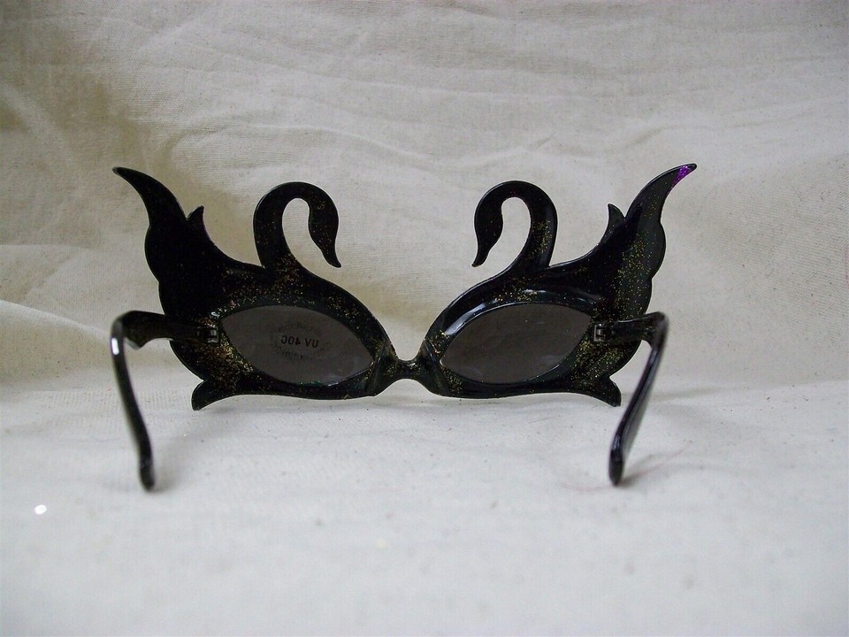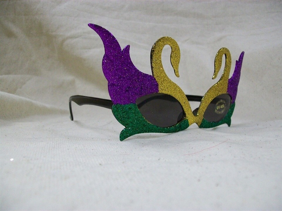 Super Tri Tone Glitter Mardi Gras themed Swan Plastic Costume Sunglasses. The frame is made up of two Swans with Purple, Green, and Yellowish Gold glitter. Lens sticker says -100% UV Protection. UV400. You'll be the life of the party with the party glasses. One size fits most. Novelty Sunglasses for cosmetic use. Does not provide any vision correction. Do not look directly into sunlight. Great for a Mardi Gras or New Orleans Themed Party, Masquerade, or a Halloween Costume Party. THESE SHED GLITTER, THERE'S EXCESS GLITTER ON BACK OF GLASSES AND INSIDE PLASTIC. THEY SHOULD BE WIPED OFF PRIOR TO WEARING SO THE GLITTER DOSEN'T GET IN EYES.