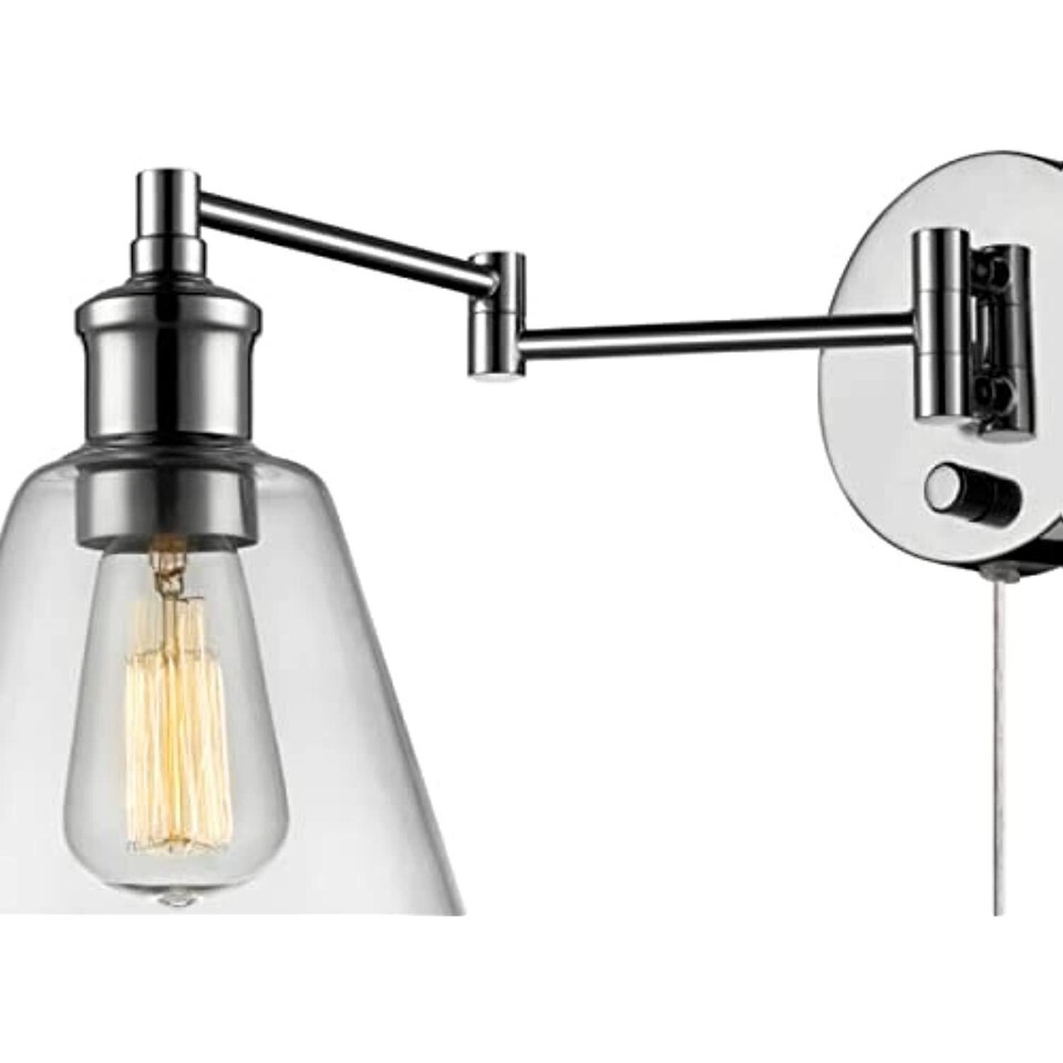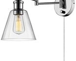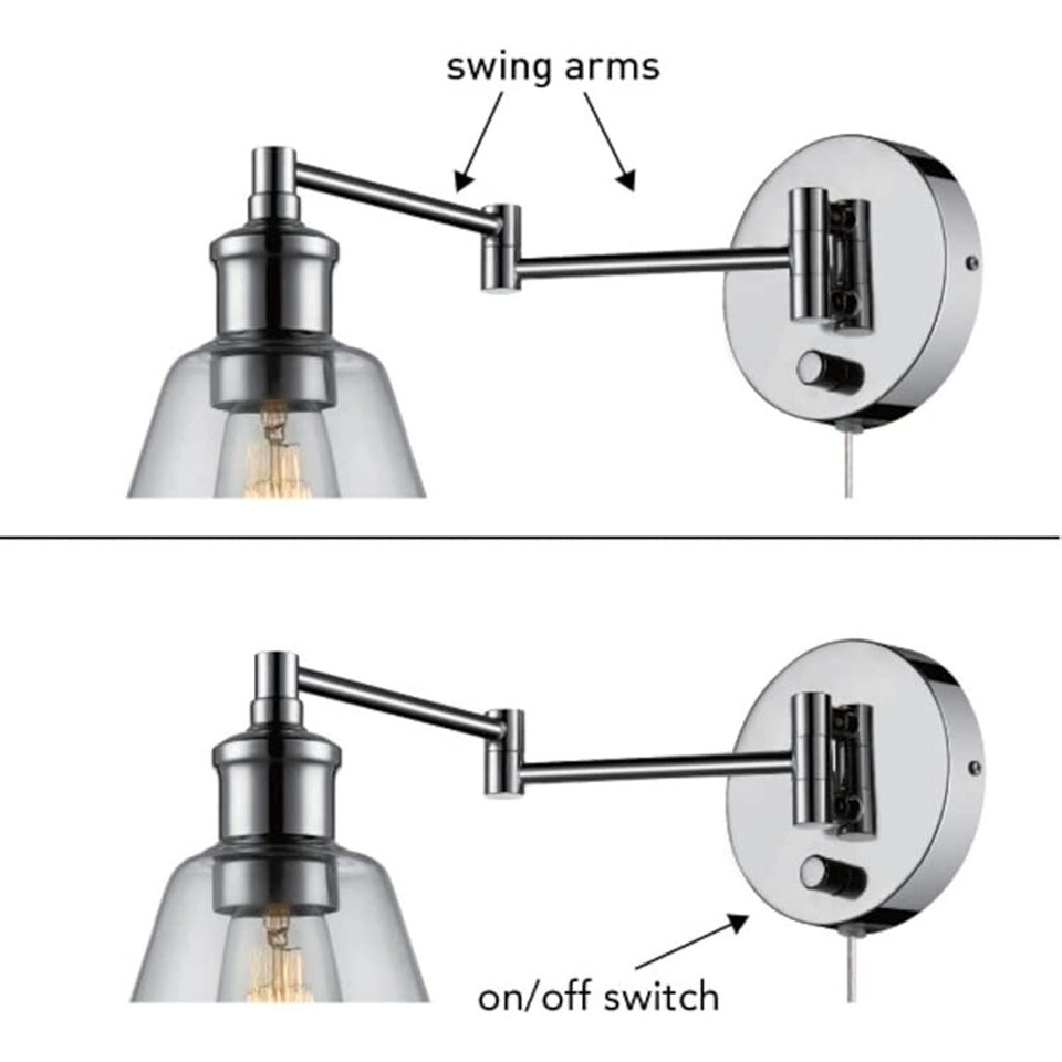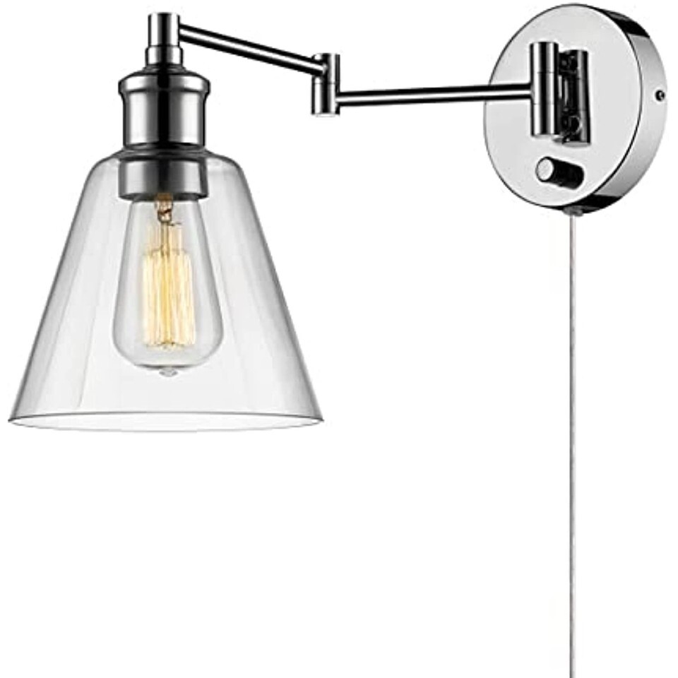 Globe Electrics LeClair 1Light PlugIn or Hardwire Industrial Wall Sconce adds a vintage industrial feel to any room. Leave it as a plugin to move it easily and create different looks in different rooms or hardwire it to your wall for a long lasting look. The clear glass shade and exposed bulb easily create different lighting ambiance and moods when adding bulbs of different brightness. Check out Globe Electrics assortment of vintage inspired designer bulbs for a look that is truly your own. The dual adjustable swing arm allows you to place the light where you need it most. Includes all mounting hardware for quick and easy installation. Specifications. Finish Chrome. Hardware Included Yes. Hardwired or Plug In Hardwired/PlugIn. Light Source LED. Mounting Type Wall Mount. Number of Bulbs Required 1Light. Recommended Bulb Type E26 Medium Base. Casing Material Metal. Design Industrial Vintage style. Depth(inches) 15.75. Heightin. 9.25. Wattage( inches 5. Widthin. 6.5. Indoor or Outdoor Indoor Hardwire or PlugIn style both. Weight 2.6 lbs