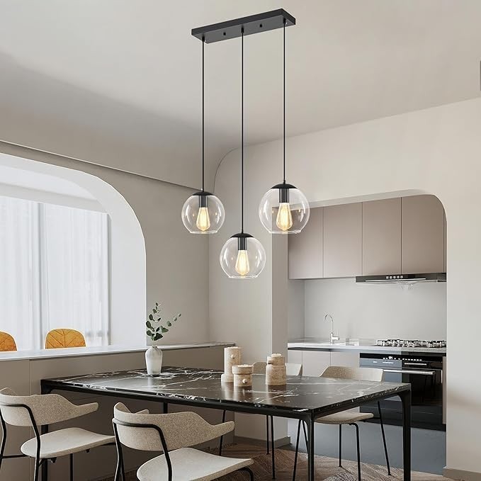 ?Customizable Lighting Dimensions?: Industrial-chic metal/glass construction with sloped ceiling compatibility. Updated specs: 16.5" canopy (42cm) + 3x 7.9" globes (20cm). Features suspension wires for precision cutting and tool-free height adjustments via canopy screws.