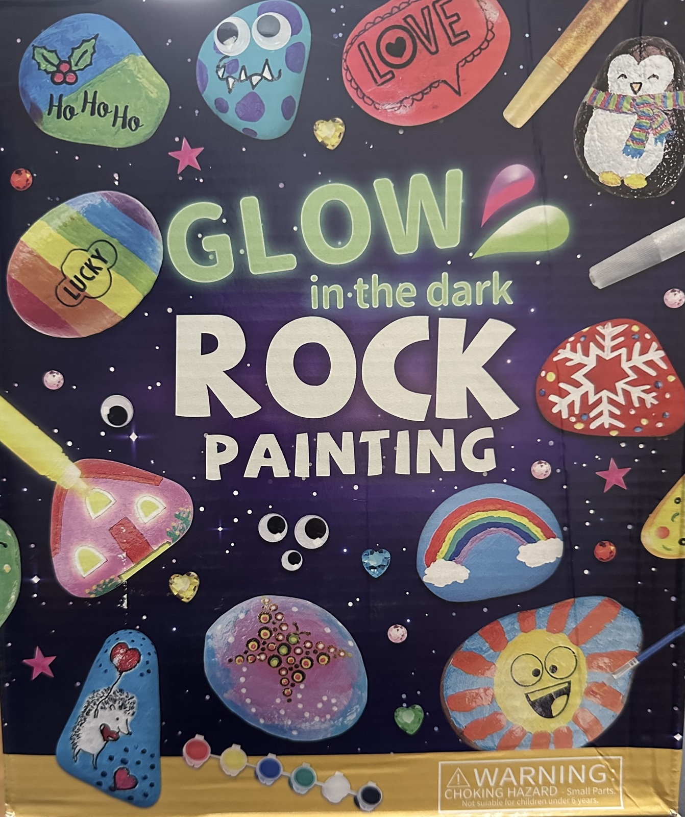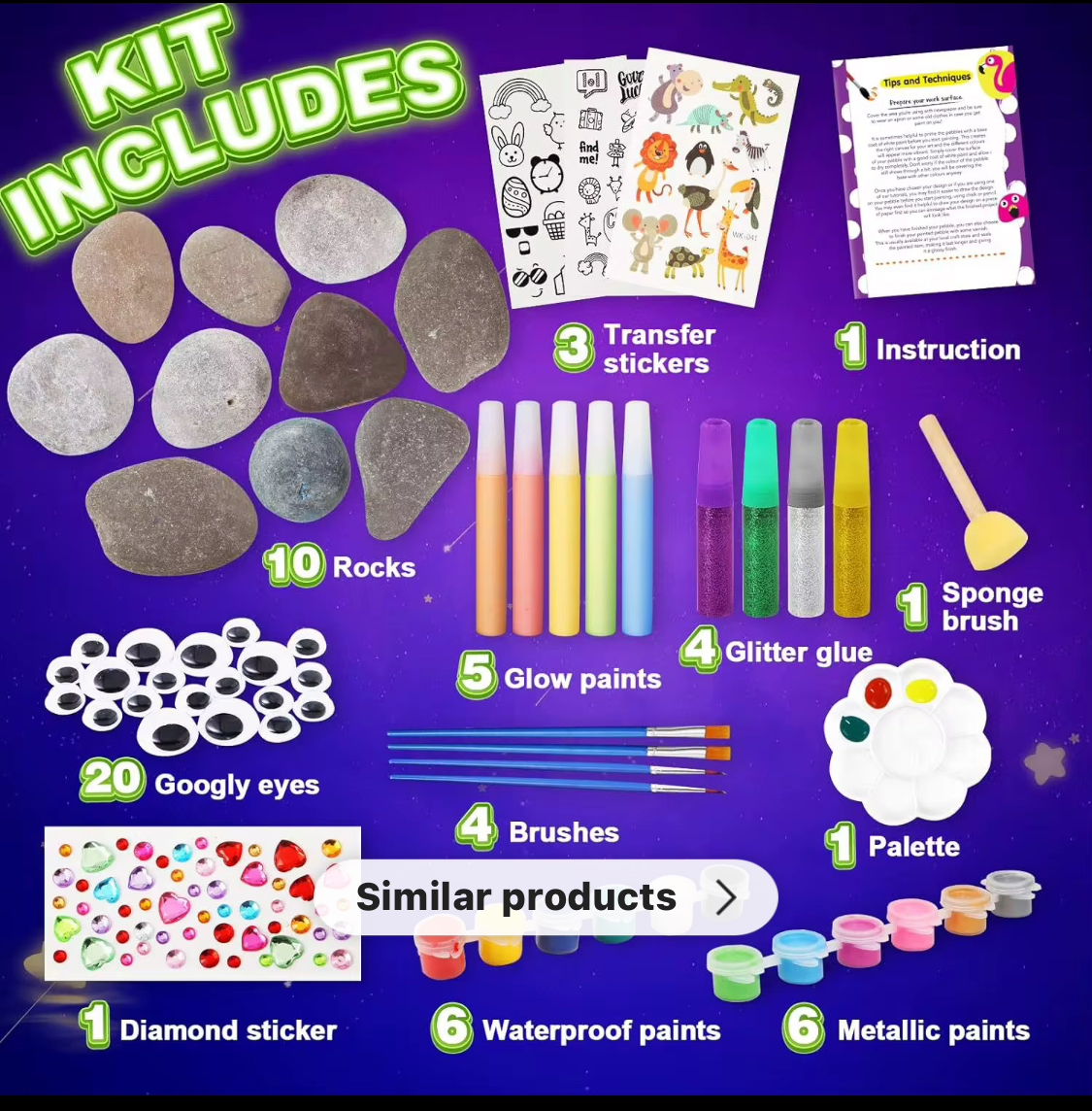 Transform ordinary rocks into magical glowing masterpieces with this complete rock painting kit! Perfect for creative kids ages 6 and up, this comprehensive set includes 10 natural rocks ready to become your canvas. The kit features 5 vibrant glow-in-the-dark paints and 6 metallic paints for endless artistic possibilities. Add sparkle with glitter glue and personality with 20 googly eyes! The set comes with 4 quality brushes, a palette for mixing colors, and a sponge brush for special effects. For extra fun, use the included transfer stickers to add cute animal and character designs. The kit also includes waterproof paints to protect your creations. Each component has been carefully selected to help young artists create enchanting rock art that comes alive at night. The detailed instruction guide makes it easy to get started. Adult supervision required. Warning: Contains small parts not suitable for children under 6 years old. Create dazzling decorations for your garden, room, or give as unique handmade gifts!