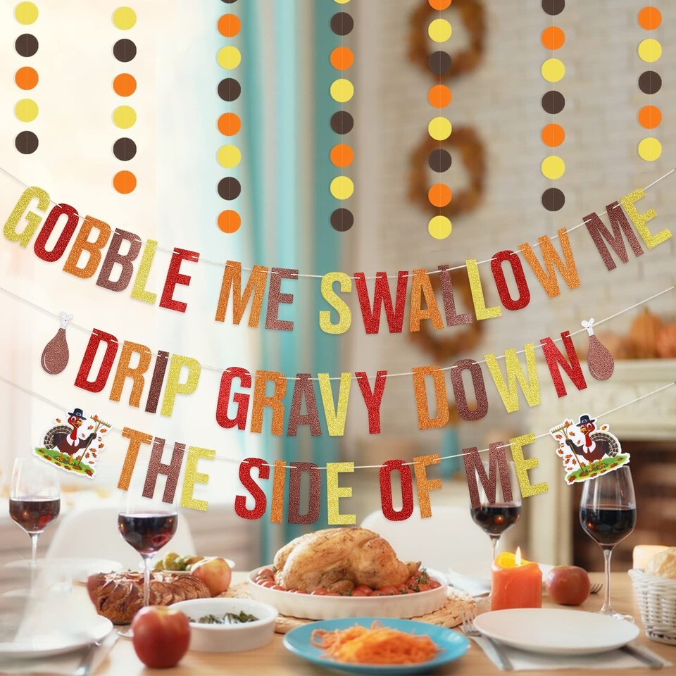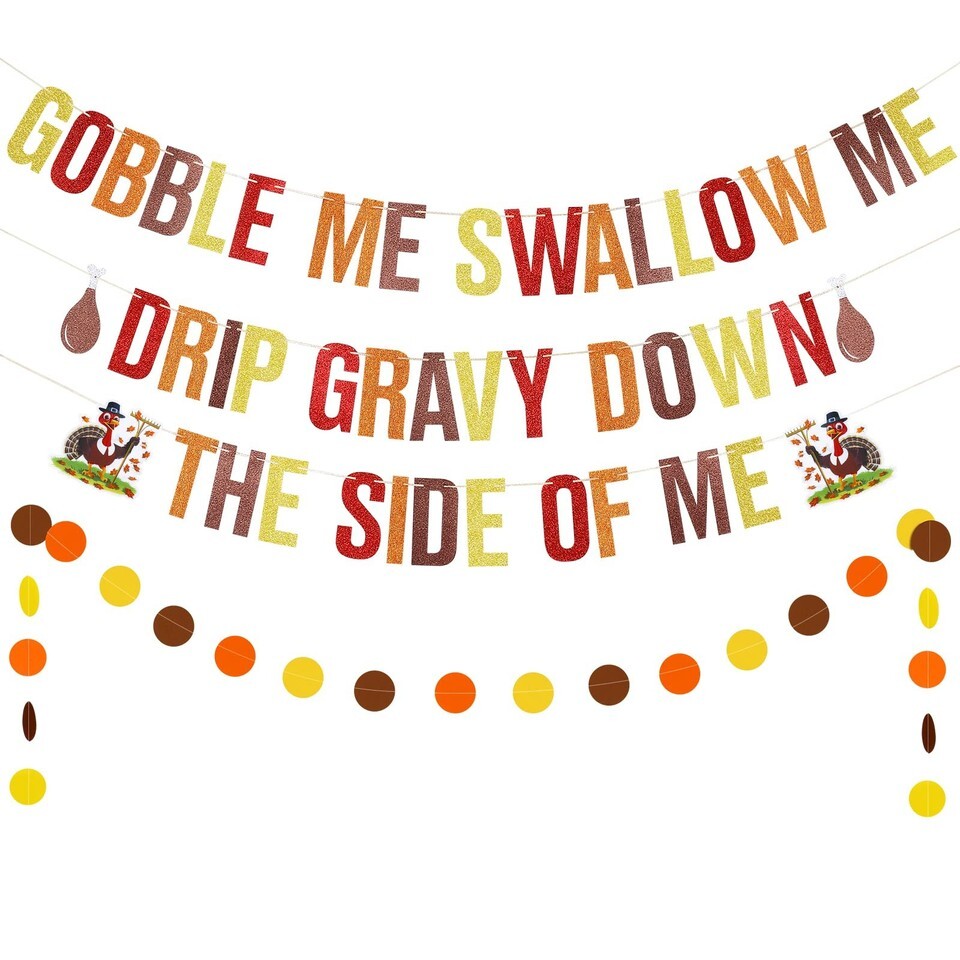 What you will get: 1Pcs Glitter Gobble Me Swallow Me Drip Gravy Down The Side Of Me banner and 1pcs circle dots garland,full of Thanksgiving feeling.It is a must-have garland to celebrate your Thanksgiving party, brighten up your home party.