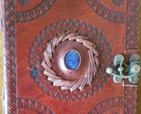 Hand tooled blank leather journal with embossing and embedded stone. 200 pages, latch closure, stones will vary. Its spine edge has attractive leather cross stitching, and the journal is secured by a latch lock. There are 200 blank hand-made pages. Measures approximately 5 x 7 x 1.25 inches.