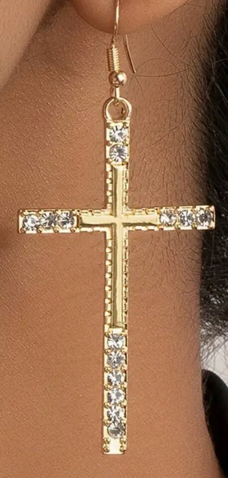 Your purchase is for a pair of gold dangle gold tone cross earrings with faux zirconia. .
